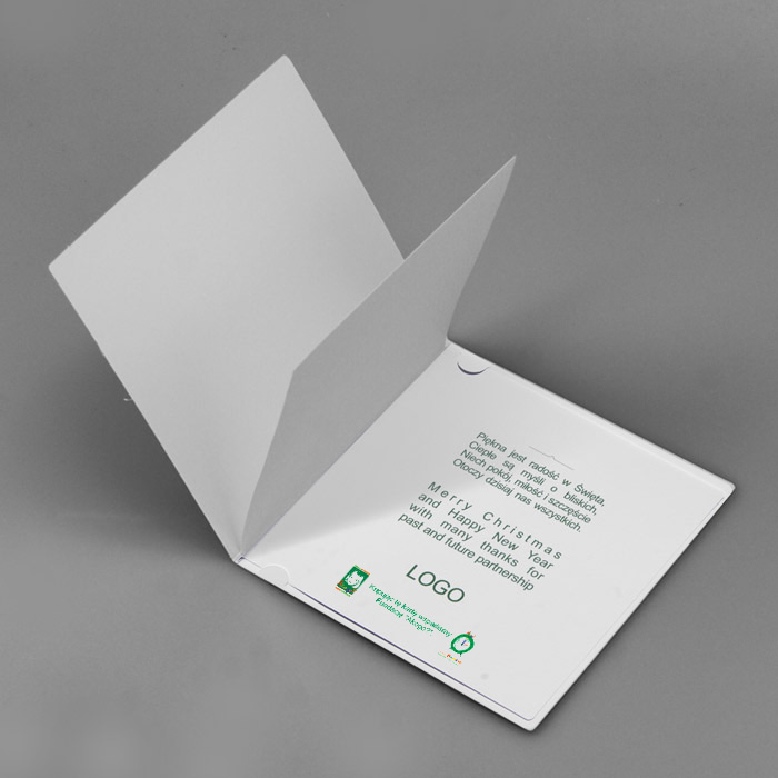 Drukowana kartka świąteczna wykonana z wysokiej jakości matowego papieru. Okładkę ozdabia barwny, świąteczny motyw. Niektóre elementy zostały dodatkowo pokryte lakierem UV. Wkładka do nadruku biała matowa.