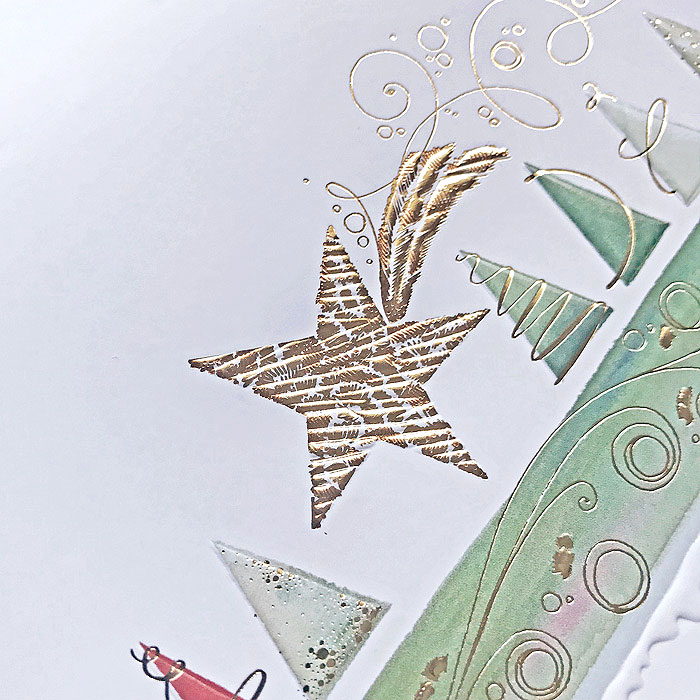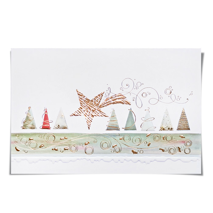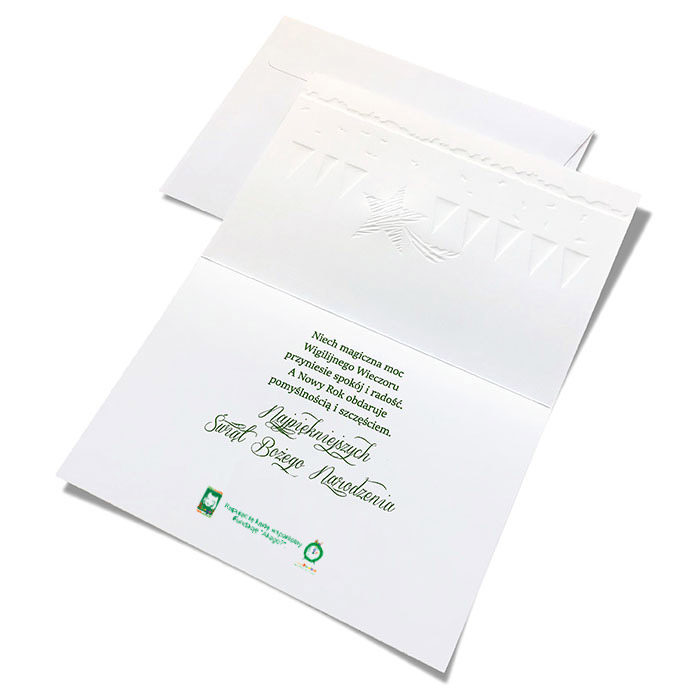 Kartka z motywem świąteczny na okładce wykonanym techniką druku uszlachetnionego złoceniem oraz tłoczeniem. Nadruk życzeń bezpośrednio wewnątrz okładki.Karty wykonane z ogromną starannością i dbałością o detale. Nowoczesne techniki drukarskie, dokładność wykonania oraz wysokiej jakości papier są nieocenionym atutem kart.