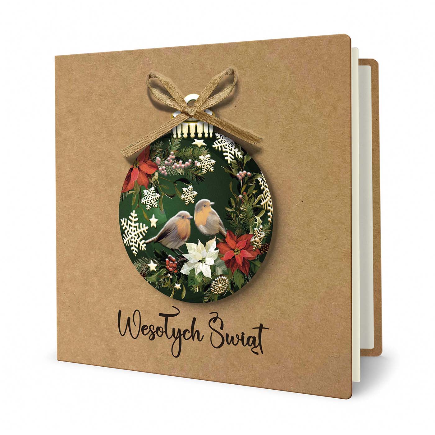 Naturalna i elegancka kartka świąteczna, która łączy świąteczne ciepło z estetyką handmade. Centralnym punktem projektu jest wyjątkowa aplikacja - drukowana bombka z zimowym motywem dwóch ptaszków wśród gwiazdek, śnieżynek i świątecznych kwiatów. Aplikacja pokryta jest złoceniem i lakierem punktowym, a całość przymocowana do kraftowej okładki. Kartkę dopełnia delikatna kokardka z satynowej wstążki w kolorze starego złota oraz napis "Wesołych Świąt" w eleganckim kroju pisma.
