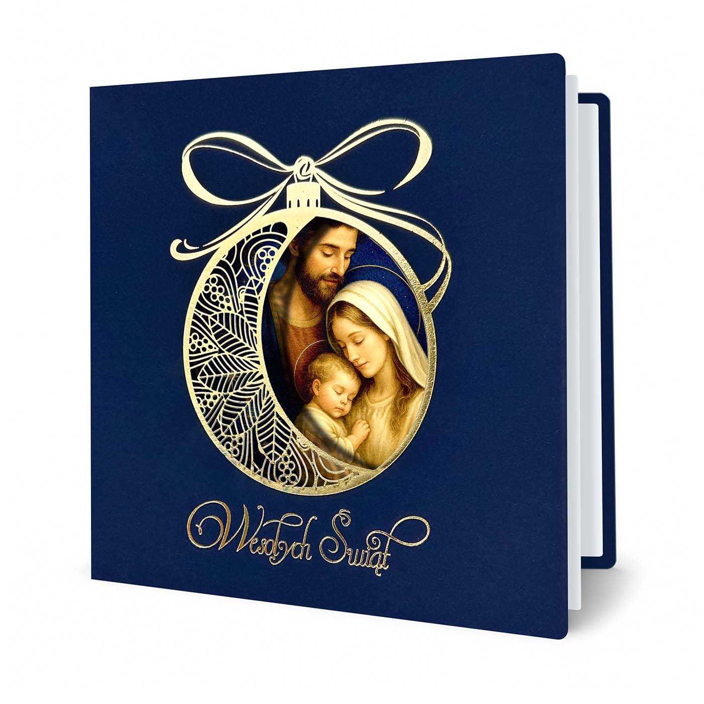 Wewnątrz ażurowego kształtu bombki umieszczono subtelną, malarską ilustrację Świętej Rodziny - Józefa, Maryi i Dzieciątka Jezus - tworząc efekt trójwymiarowej głębi. Całość dopełnia złocony napis "Wesołych Świąt" umieszczony pod motywem.