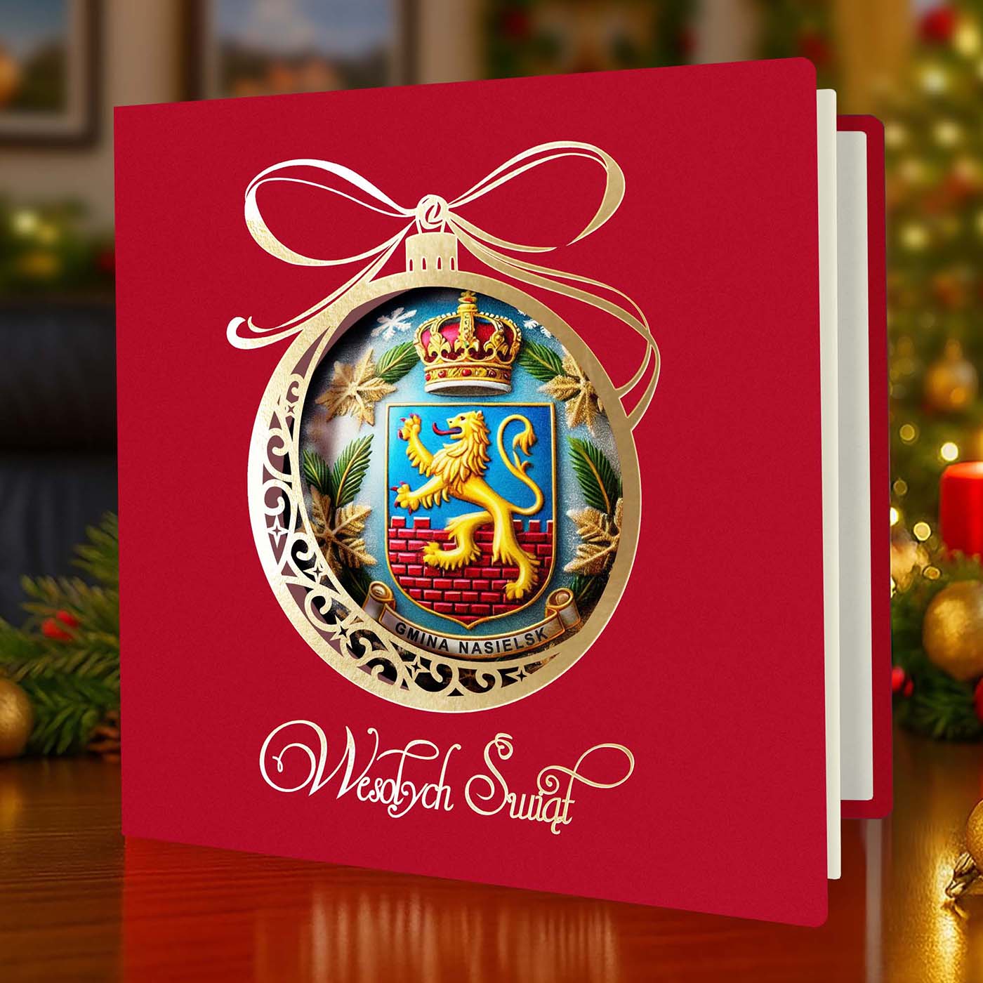 Ekskluzywna kartka świąteczna o unikalnym charakterze, wykonana z wysokiej jakości papieru w eleganckim czerwonym kolorze. Centralnym elementem jest precyzyjnie wycięta laserowo bombka, ozdobiona złoconymi detalami i napisem Wesołych Świąt. Wewnątrz bombki znajduje się grafika przygotowana na indywidualne zamówienie - może to być Twoje logo, herb miasta, budynek firmy, maszyna z branży budowlanej czy produkt, który chcesz wypromować w świątecznym klimacie.