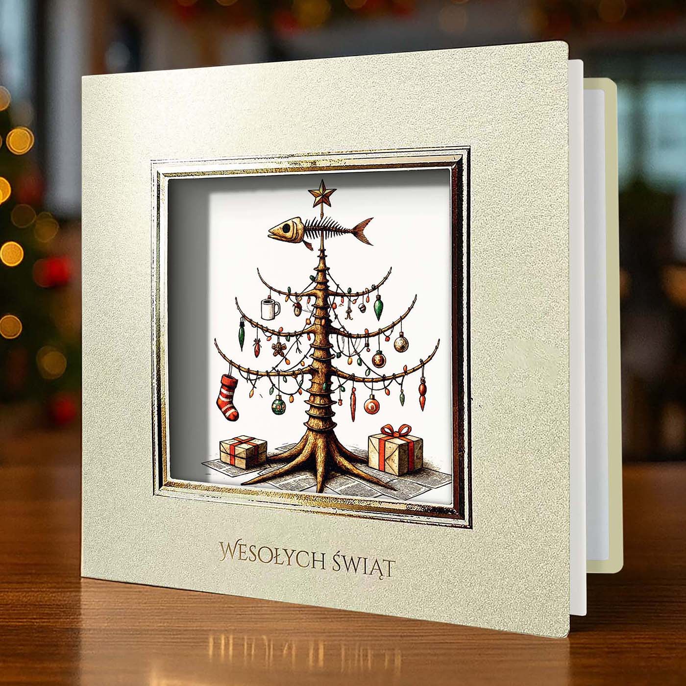 Okładka posiada kwadratowy otwór ze złoconą i tłoczoną ramką wokół, a wewnątrz umieszczona jest grafika zaprojektowana na indywidualne zamówienie - może to być Twoje logo, herb miasta, budynek firmy, maszyna z branży budowlanej czy produkt, który chcesz zaprezentować w świątecznym klimacie.