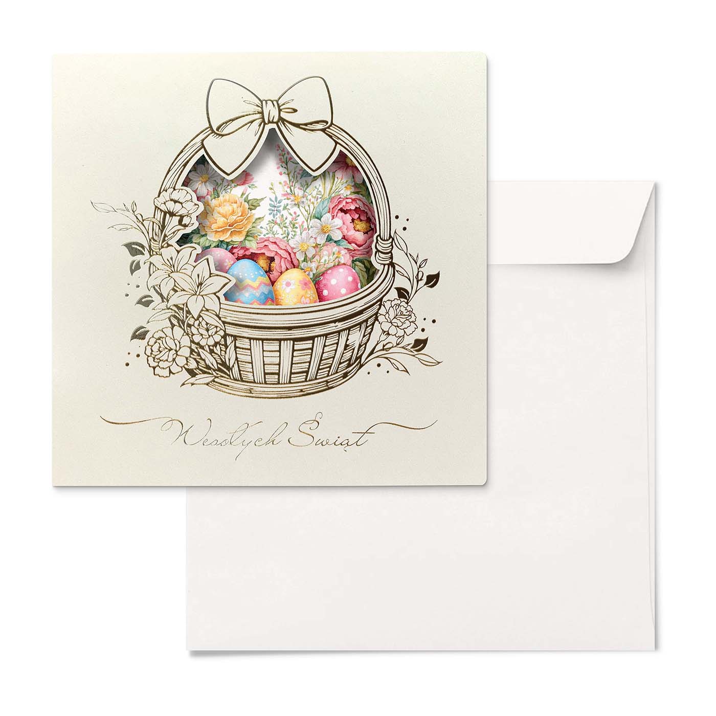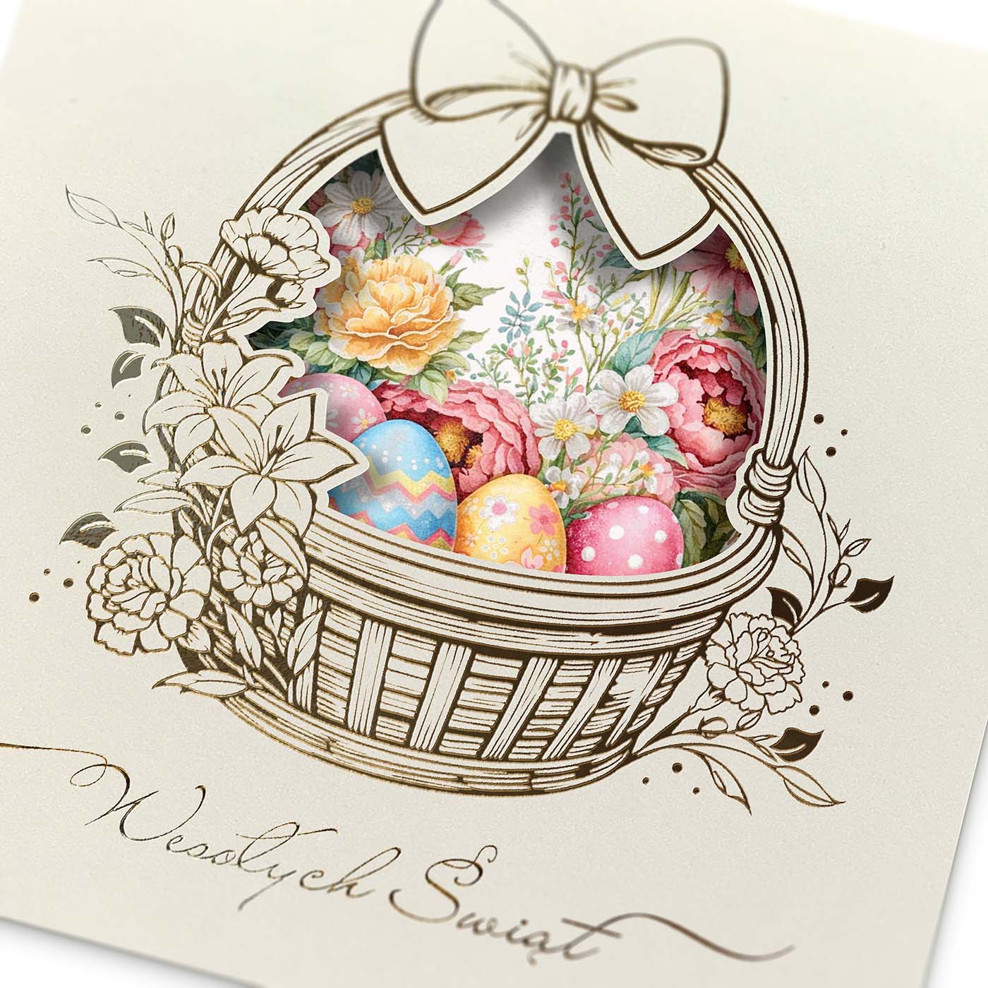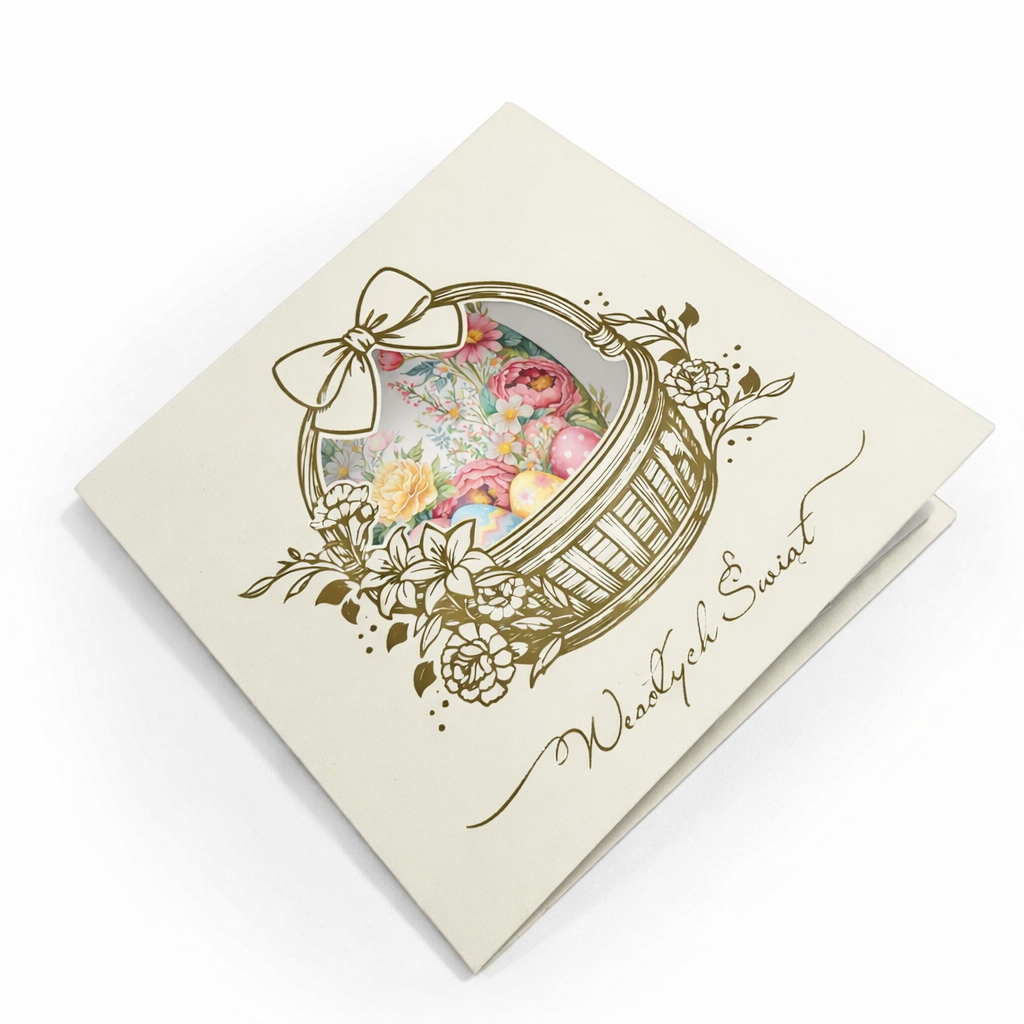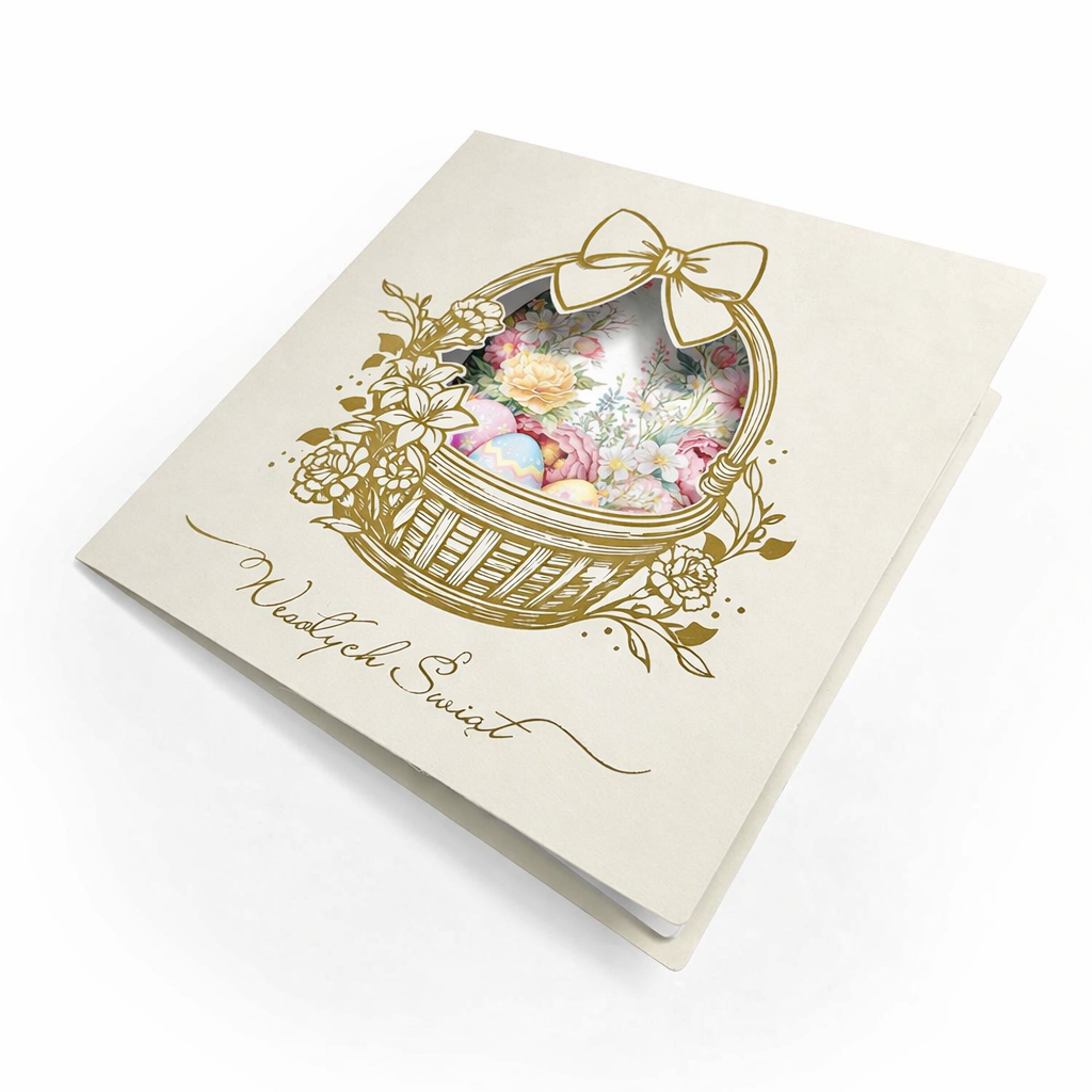 Centralnym motywem kartki jest koszyk wielkanocny wypełniony kolorowymi pisankami, ujęty w dekoracyjną, subtelnie ażurową oprawę. Delikatna ilustracja oraz jasna, kremowa kolorystyka nadają całości lekkości i szlachetności, dzięki czemu kartka doskonale wpisuje się w elegancką komunikację B2B. Motyw wiosenny symbolizuje odnowę, harmonię i pozytywny początek - bez nadmiernej dosłowności.