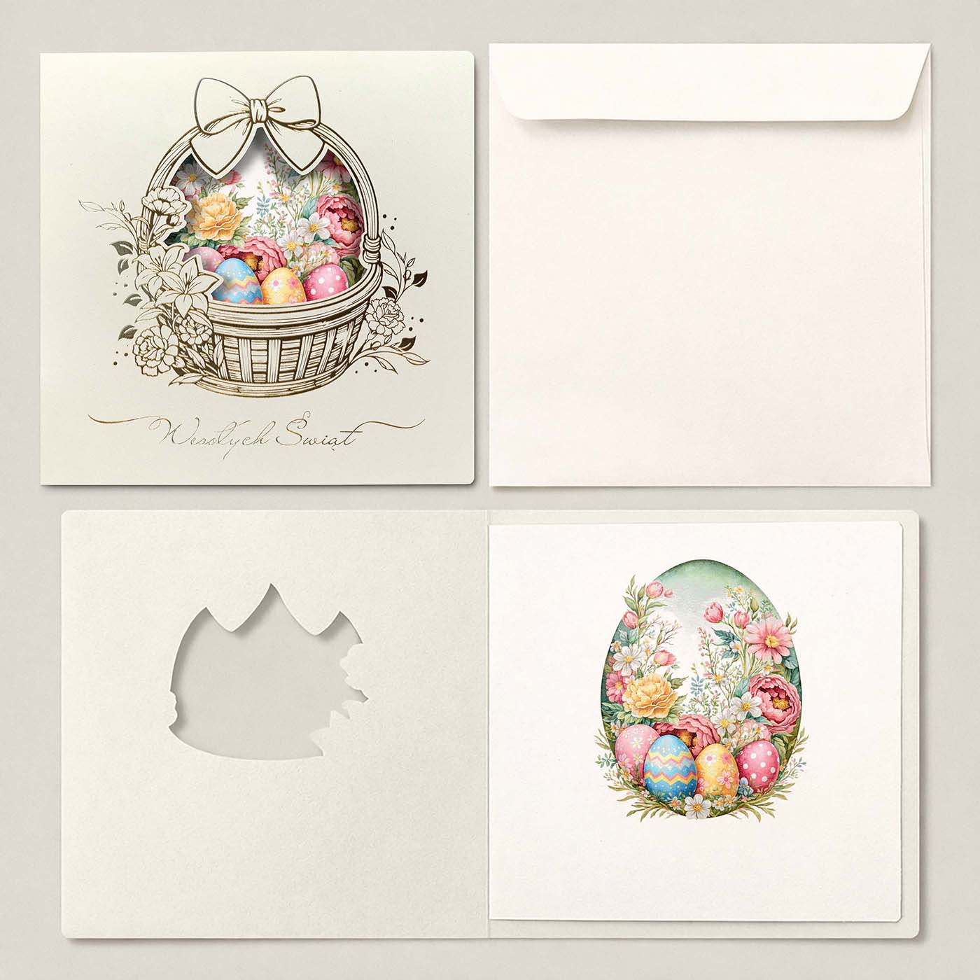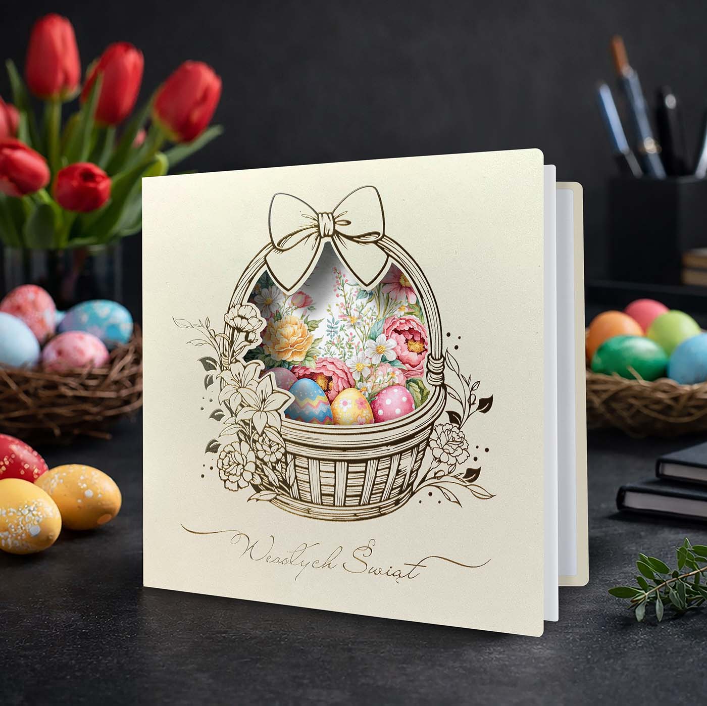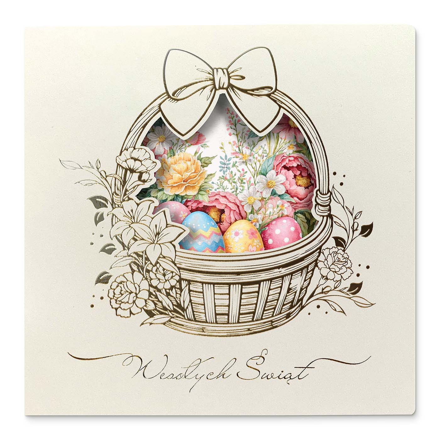 Centralnym motywem kartki jest koszyk wielkanocny wypełniony kolorowymi pisankami, ujęty w dekoracyjną, subtelnie ażurową oprawę. Delikatna ilustracja oraz jasna, kremowa kolorystyka nadają całości lekkości i szlachetności, dzięki czemu kartka doskonale wpisuje się w elegancką komunikację B2B. Motyw wiosenny symbolizuje odnowę, harmonię i pozytywny początek - bez nadmiernej dosłowności.