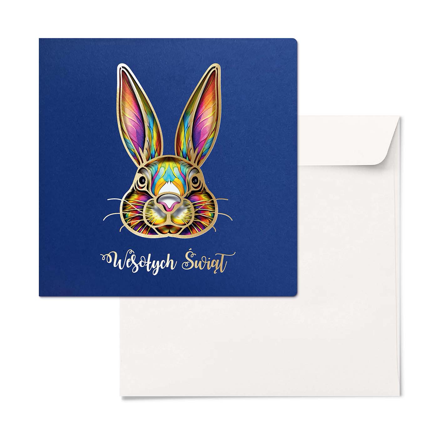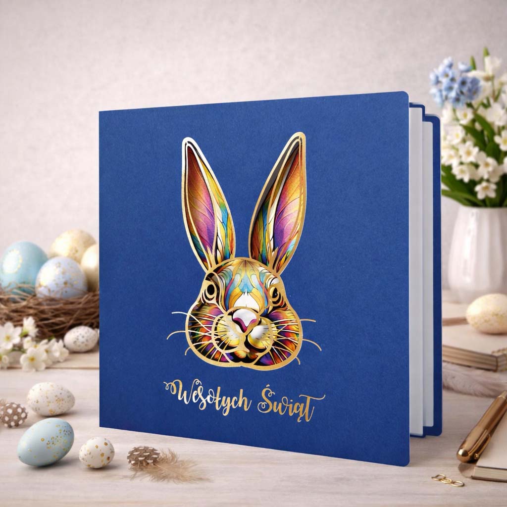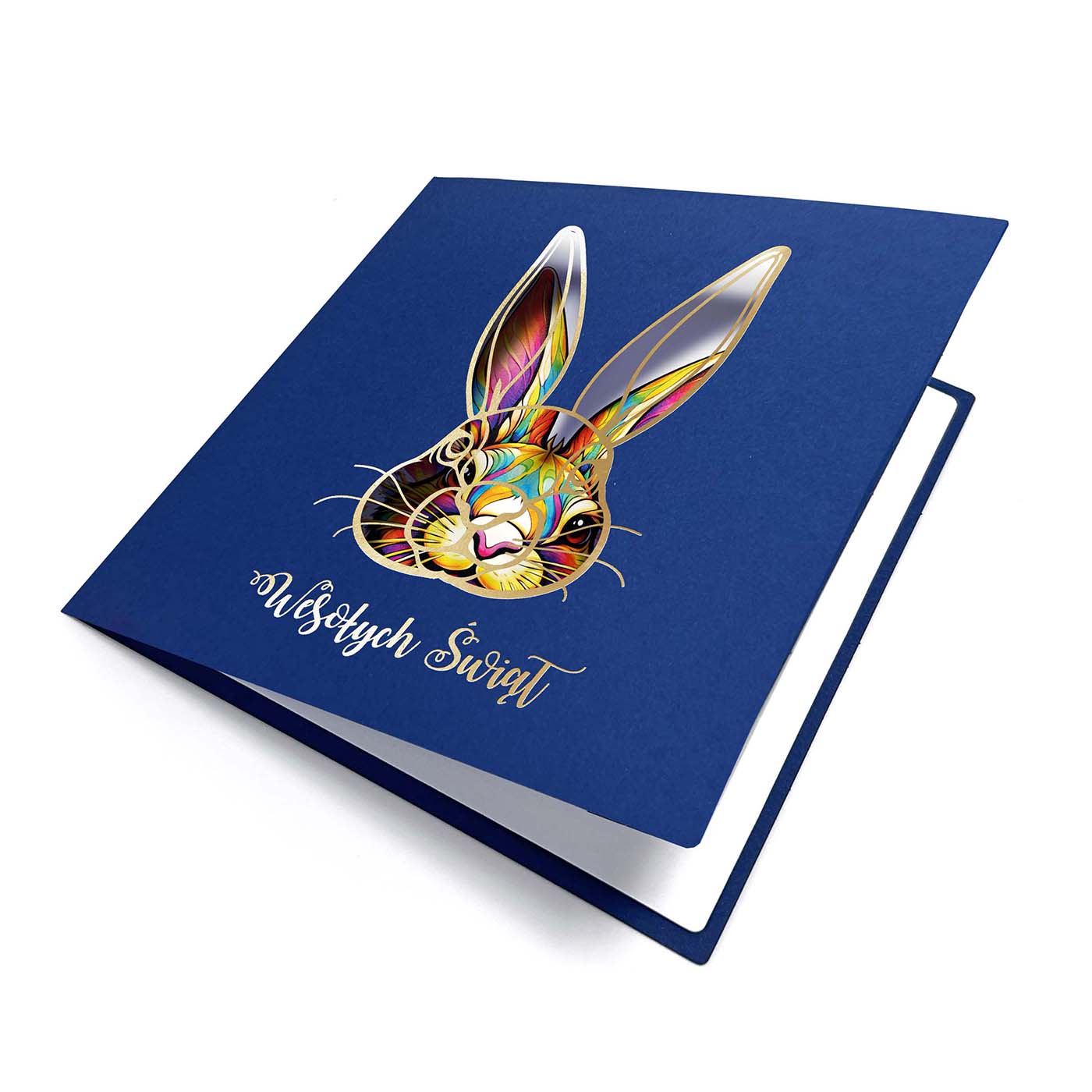 Okładka została wykonana z wysokogatunkowego papieru ozdobnego w głębokim odcieniu granatu, o gładkiej, przyjemnej w dotyku powierzchni. Centralnym elementem projektu jest artystycznie stylizowany wizerunek zająca wielkanocnego, wykonany w bogatej, dekoracyjnej kolorystyce i podkreślony złotymi konturami. Precyzyjne detale oraz kontrastowe zestawienie barw nadają kartce prestiżowego, nowoczesnego wyglądu. Wnętrze kartki uzupełnia jasna, matowa wkładka przeznaczona do nadruku życzeń.