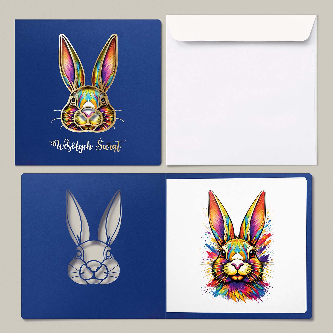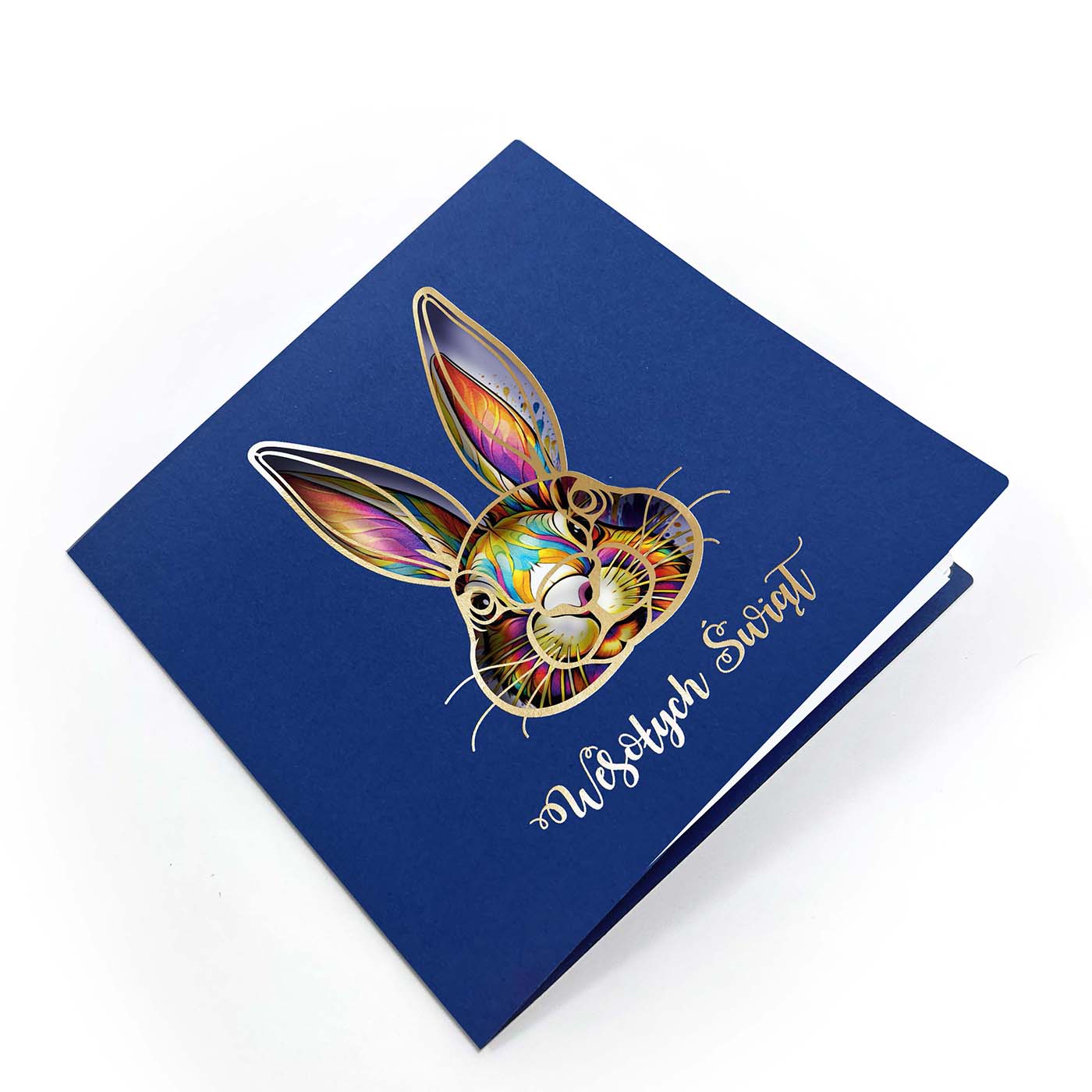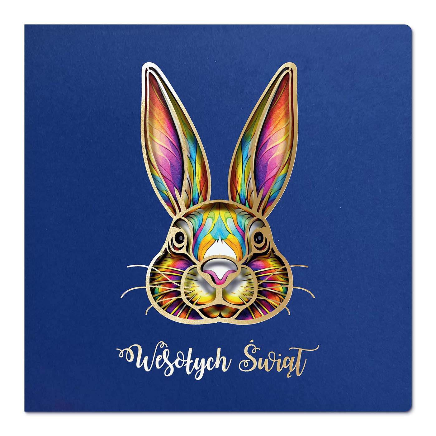 Okładka została wykonana z wysokogatunkowego papieru ozdobnego w głębokim odcieniu granatu, o gładkiej, przyjemnej w dotyku powierzchni. Centralnym elementem projektu jest artystycznie stylizowany wizerunek zająca wielkanocnego, wykonany w bogatej, dekoracyjnej kolorystyce i podkreślony złotymi konturami. Precyzyjne detale oraz kontrastowe zestawienie barw nadają kartce prestiżowego, nowoczesnego wyglądu. Wnętrze kartki uzupełnia jasna, matowa wkładka przeznaczona do nadruku życzeń.