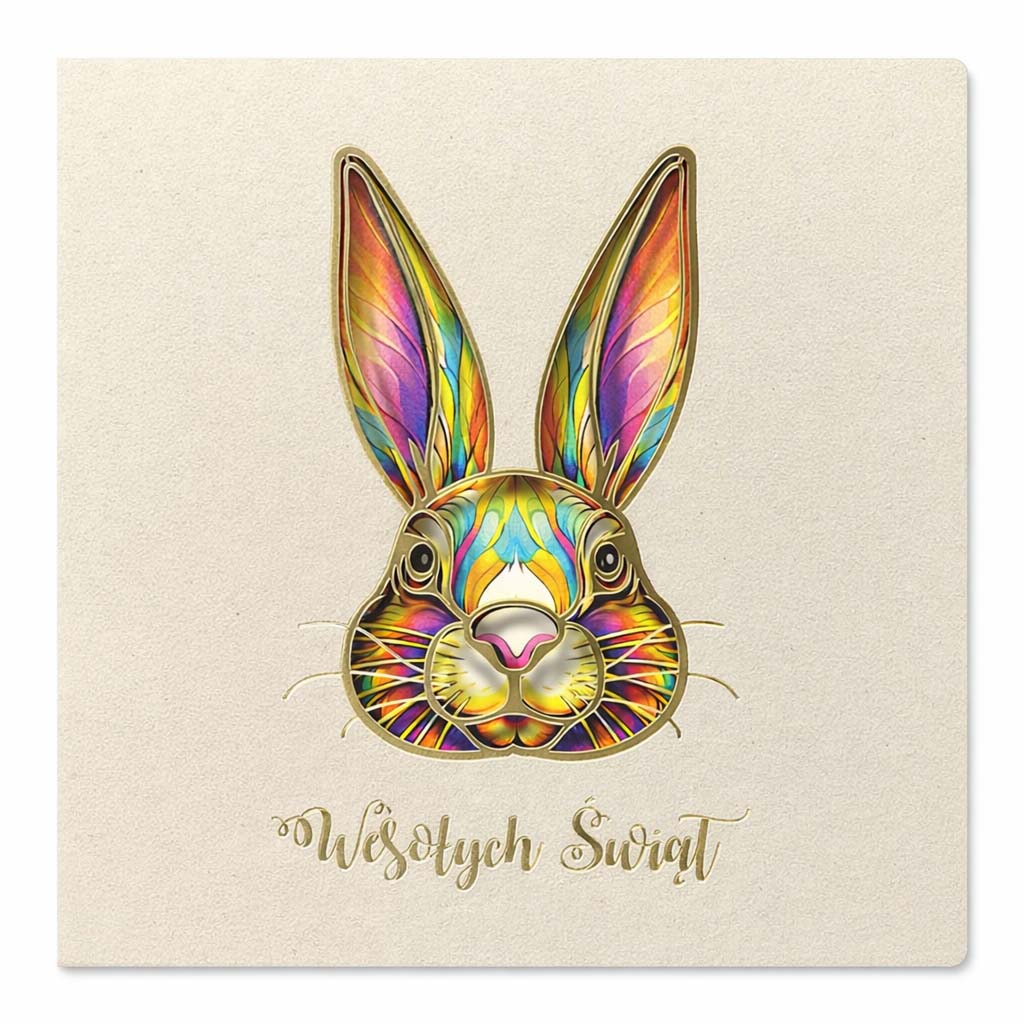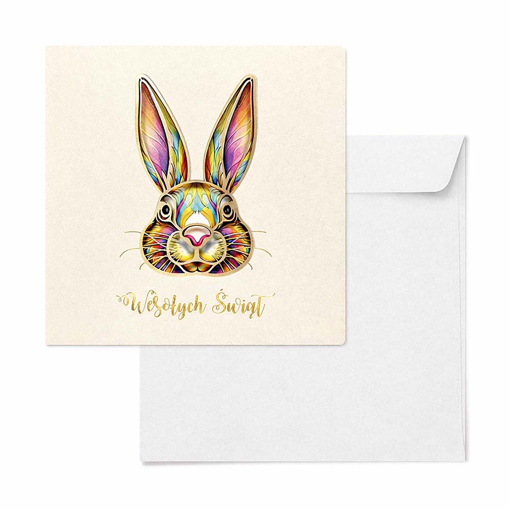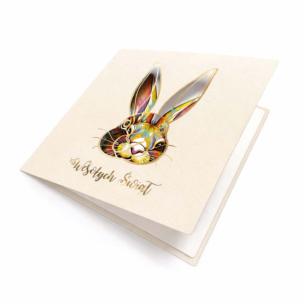 Okładka została wykonana z wysokiej jakości papieru ozdobnego w jasnym, naturalnym odcieniu, o delikatnej fakturze i matowym wykończeniu. Jej centralnym elementem jest artystycznie stylizowany wizerunek zająca wielkanocnego, wykonany w wielobarwnej, dekoracyjnej stylistyce. Subtelne złote akcenty w konturach oraz napisie dodają kartce elegancji i prestiżu, nie zaburzając jej czystej, harmonijnej formy. Wnętrze kartki uzupełnia jasna, matowa wkładka przeznaczona do nadruku życzeń.