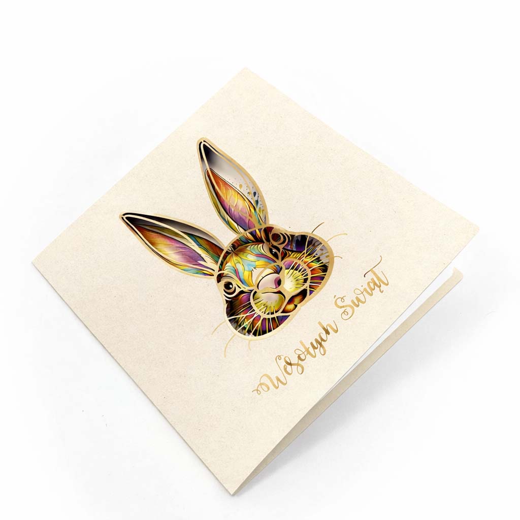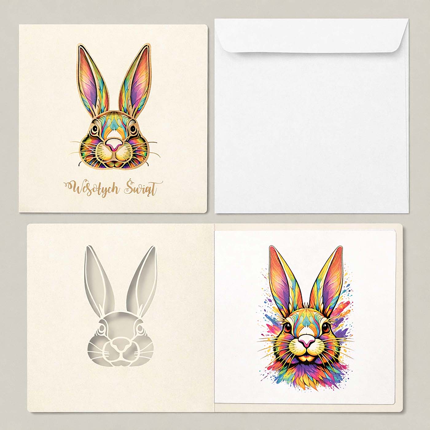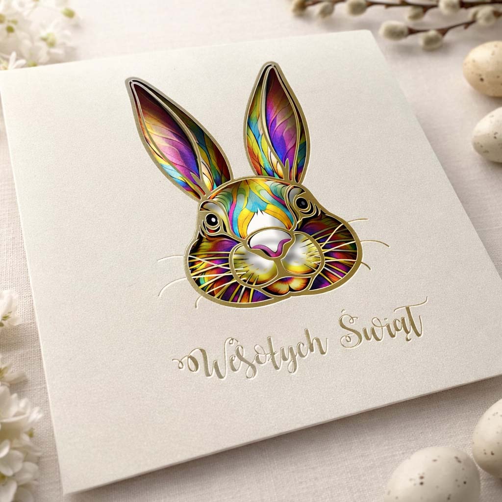 Okładka została wykonana z wysokiej jakości papieru ozdobnego w jasnym, naturalnym odcieniu, o delikatnej fakturze i matowym wykończeniu. Jej centralnym elementem jest artystycznie stylizowany wizerunek zająca wielkanocnego, wykonany w wielobarwnej, dekoracyjnej stylistyce. Subtelne złote akcenty w konturach oraz napisie dodają kartce elegancji i prestiżu, nie zaburzając jej czystej, harmonijnej formy. Wnętrze kartki uzupełnia jasna, matowa wkładka przeznaczona do nadruku życzeń.