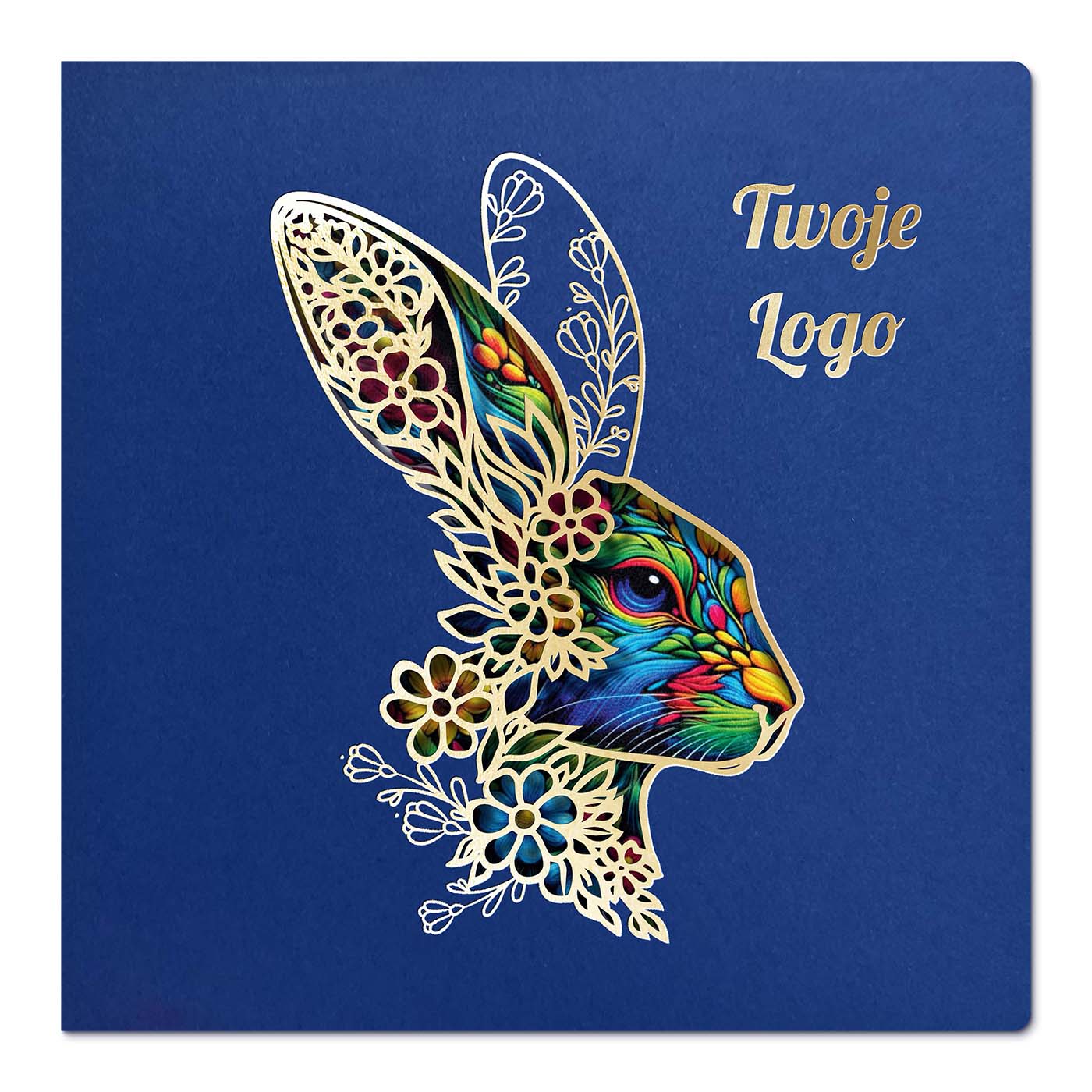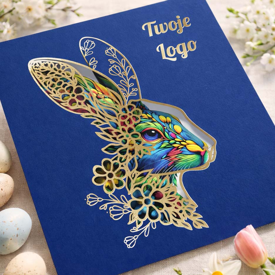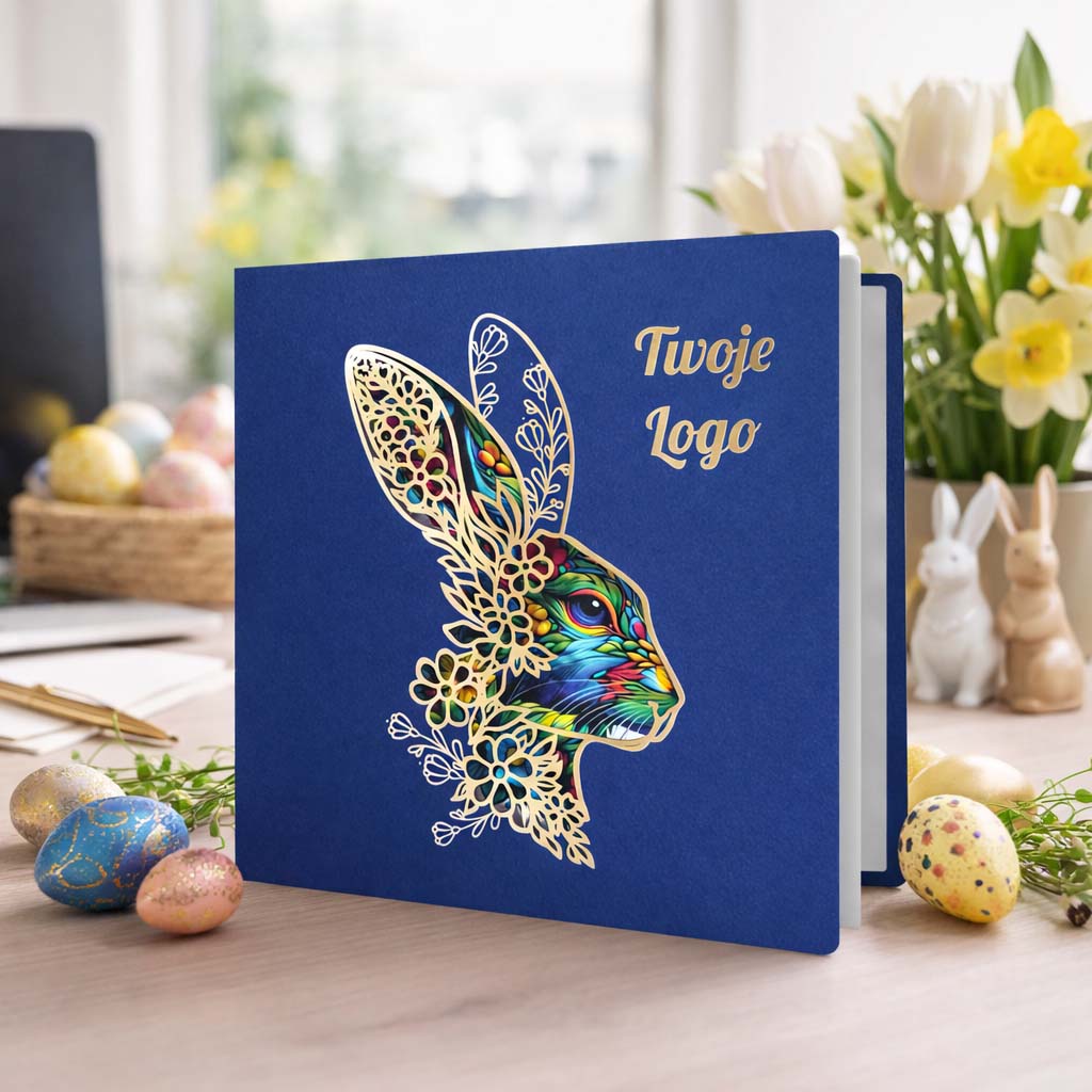 Ekskluzywna kartka wielkanocna zaprojektowana z myślą o firmach, które chcą podkreślić swój profesjonalny wizerunek poprzez elegancką, nowoczesną formę świątecznych życzeń. Głęboki granat okładki tworzy szlachetne tło dla artystycznego motywu zająca wielkanocnego - symbolu energii, odrodzenia i nowego początku - przedstawionego w bogatej, wielobarwnej stylistyce.