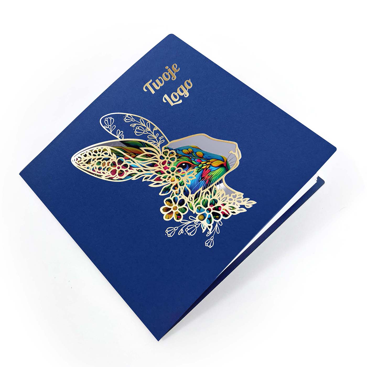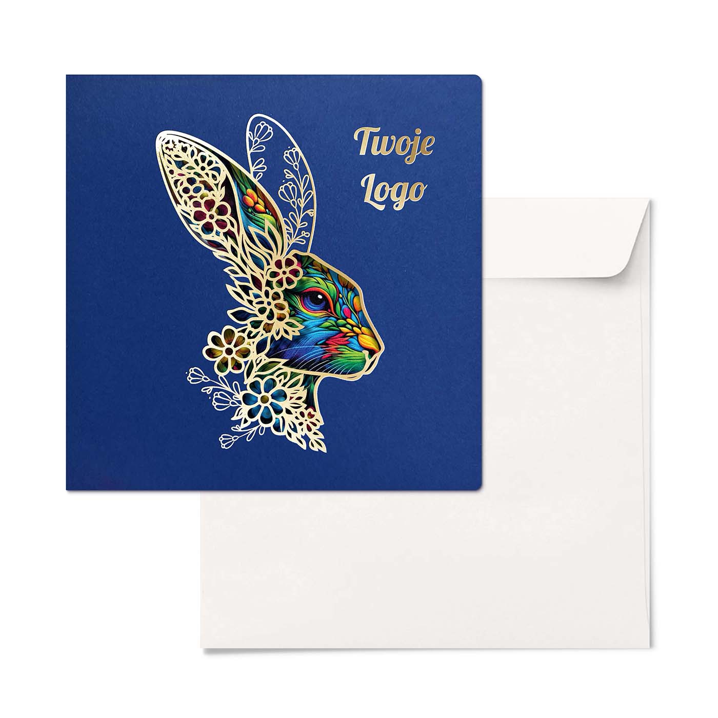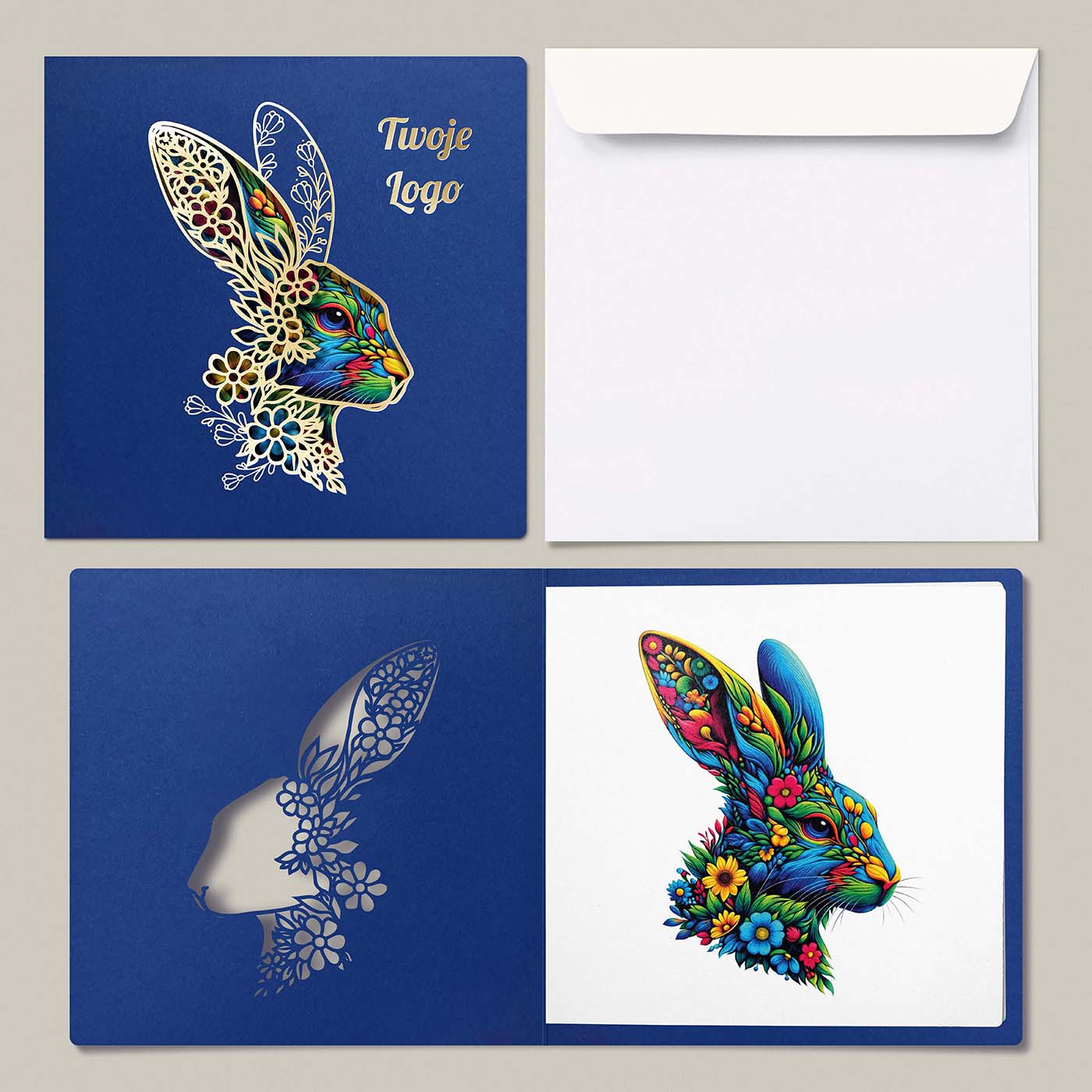 Ekskluzywna kartka wielkanocna zaprojektowana z myślą o firmach, które chcą podkreślić swój profesjonalny wizerunek poprzez elegancką, nowoczesną formę świątecznych życzeń. Głęboki granat okładki tworzy szlachetne tło dla artystycznego motywu zająca wielkanocnego - symbolu energii, odrodzenia i nowego początku - przedstawionego w bogatej, wielobarwnej stylistyce.