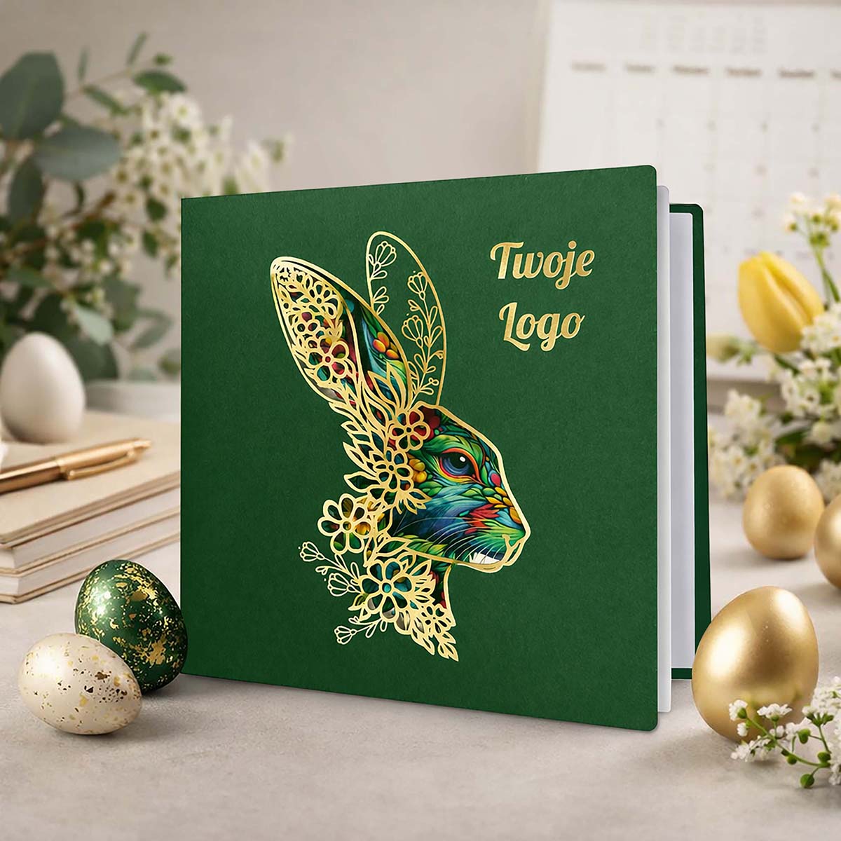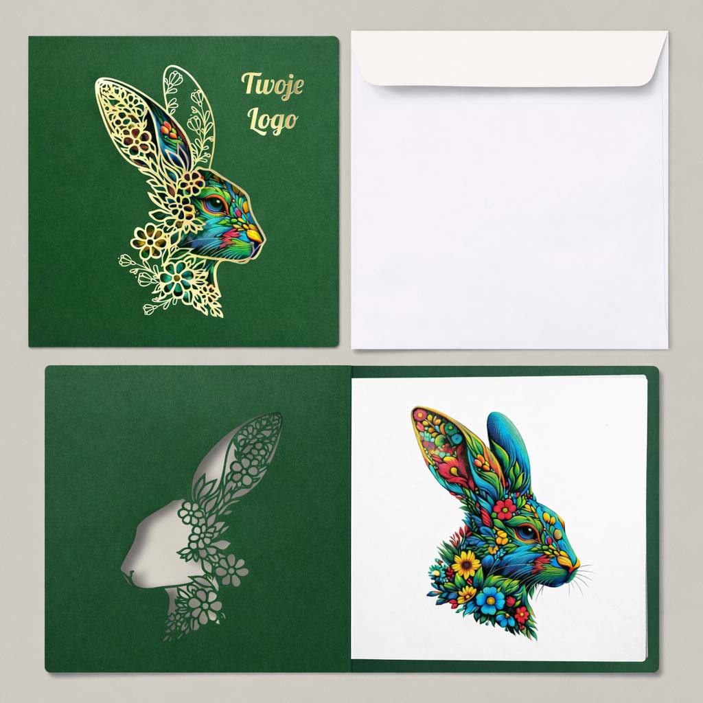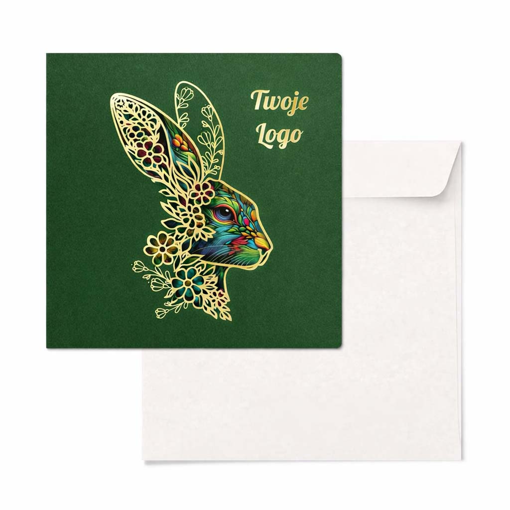 Elegancka kartka wielkanocna zaprojektowana z myślą o firmach i instytucjach, które cenią spójny wizerunek, wysoką estetykę oraz ponadczasową formę świątecznych życzeń. Głęboka zieleń okładki w połączeniu ze złotymi detalami tworzy kompozycję wyważoną, prestiżową i doskonale wpisującą się w charakter komunikacji biznesowej.