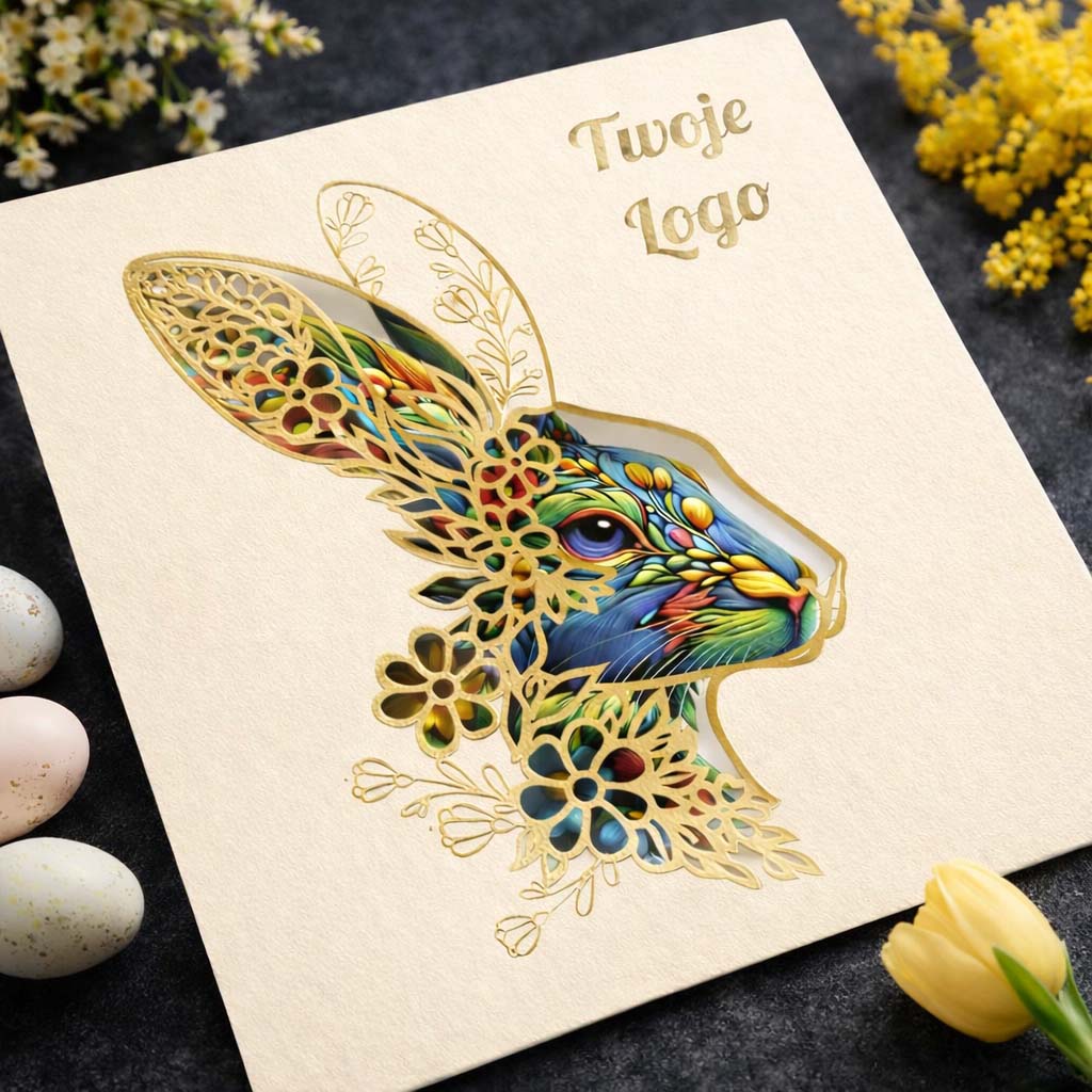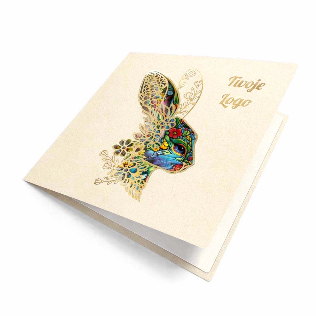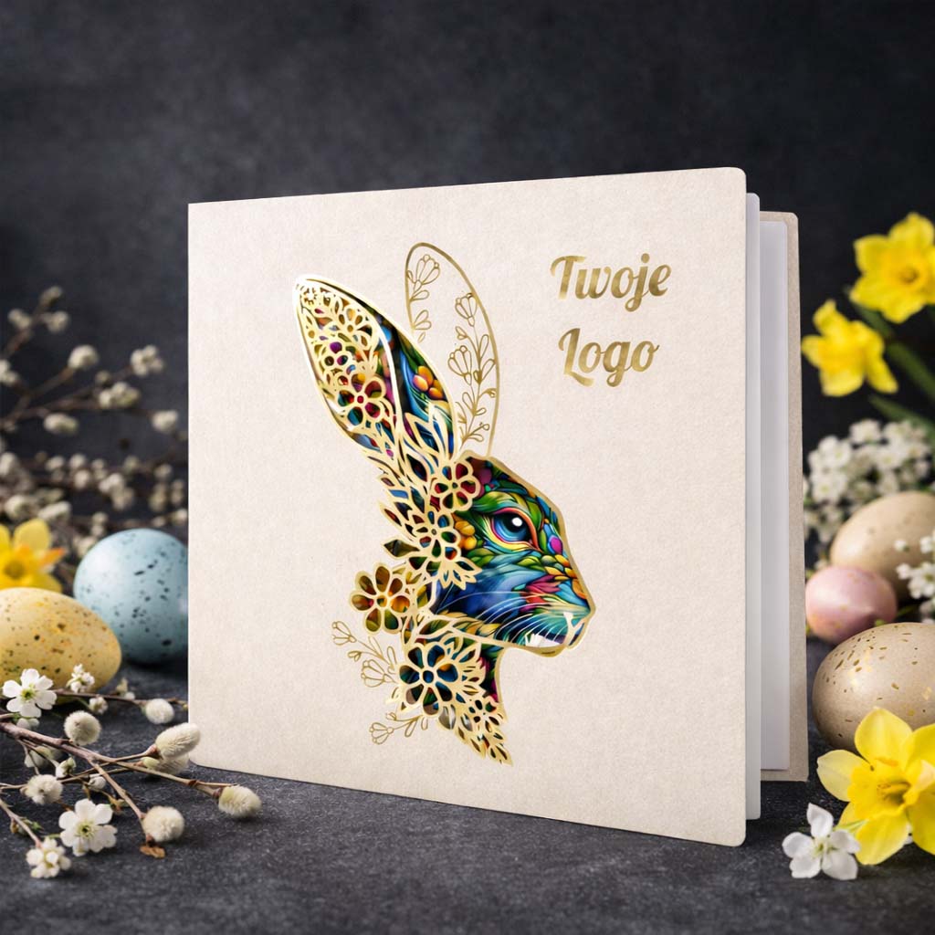 Elegancka kartka wielkanocna zaprojektowana z myślą o firmach i instytucjach, które chcą podkreślić swój profesjonalny wizerunek poprzez ponadczasową, stonowaną formę świątecznych życzeń. Jasny odcień ecru okładki tworzy spokojne, szlachetne tło dla artystycznego motywu zająca wielkanocnego - symbolu odrodzenia, harmonii i nowego początku - przedstawionego w subtelnej, dekoracyjnej stylistyce.