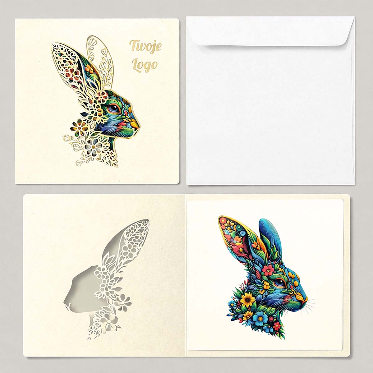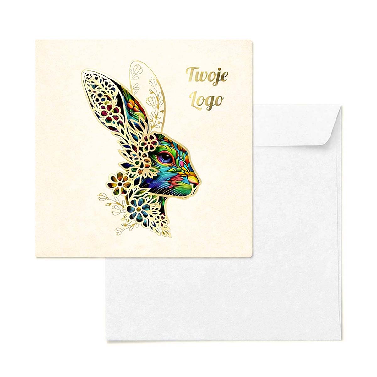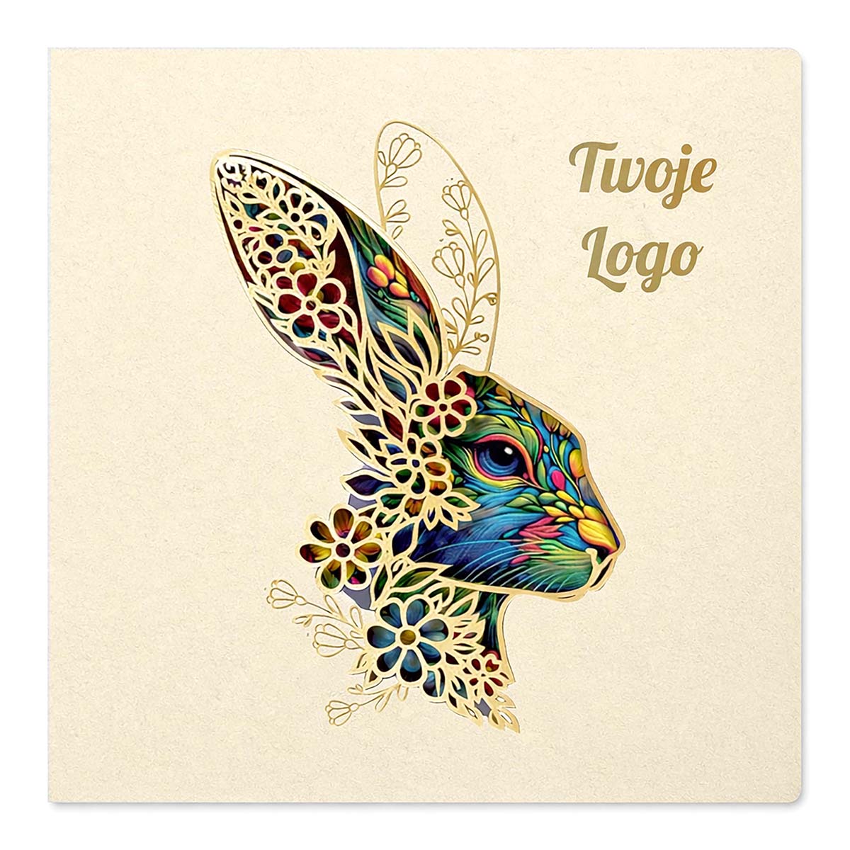 Elegancka kartka wielkanocna zaprojektowana z myślą o firmach i instytucjach, które chcą podkreślić swój profesjonalny wizerunek poprzez ponadczasową, stonowaną formę świątecznych życzeń. Jasny odcień ecru okładki tworzy spokojne, szlachetne tło dla artystycznego motywu zająca wielkanocnego - symbolu odrodzenia, harmonii i nowego początku - przedstawionego w subtelnej, dekoracyjnej stylistyce.