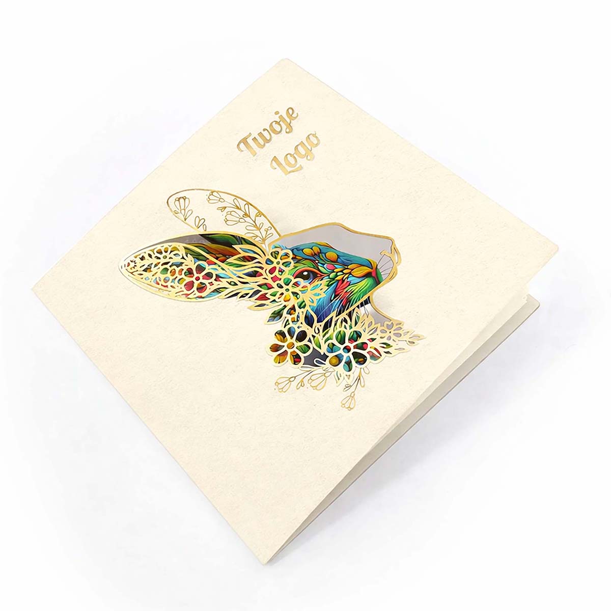 Na okładce przewidziano miejsce na logo firmy, które może zostać wykonane w formie złocenia (hot-stamping) lub jako laserowo, spójnie wpisujące się w estetykę projektu. Wnętrze kartki utrzymane jest w jasnej, neutralnej tonacji i przygotowane pod nadruk życzeń firmowych oraz logotypu.