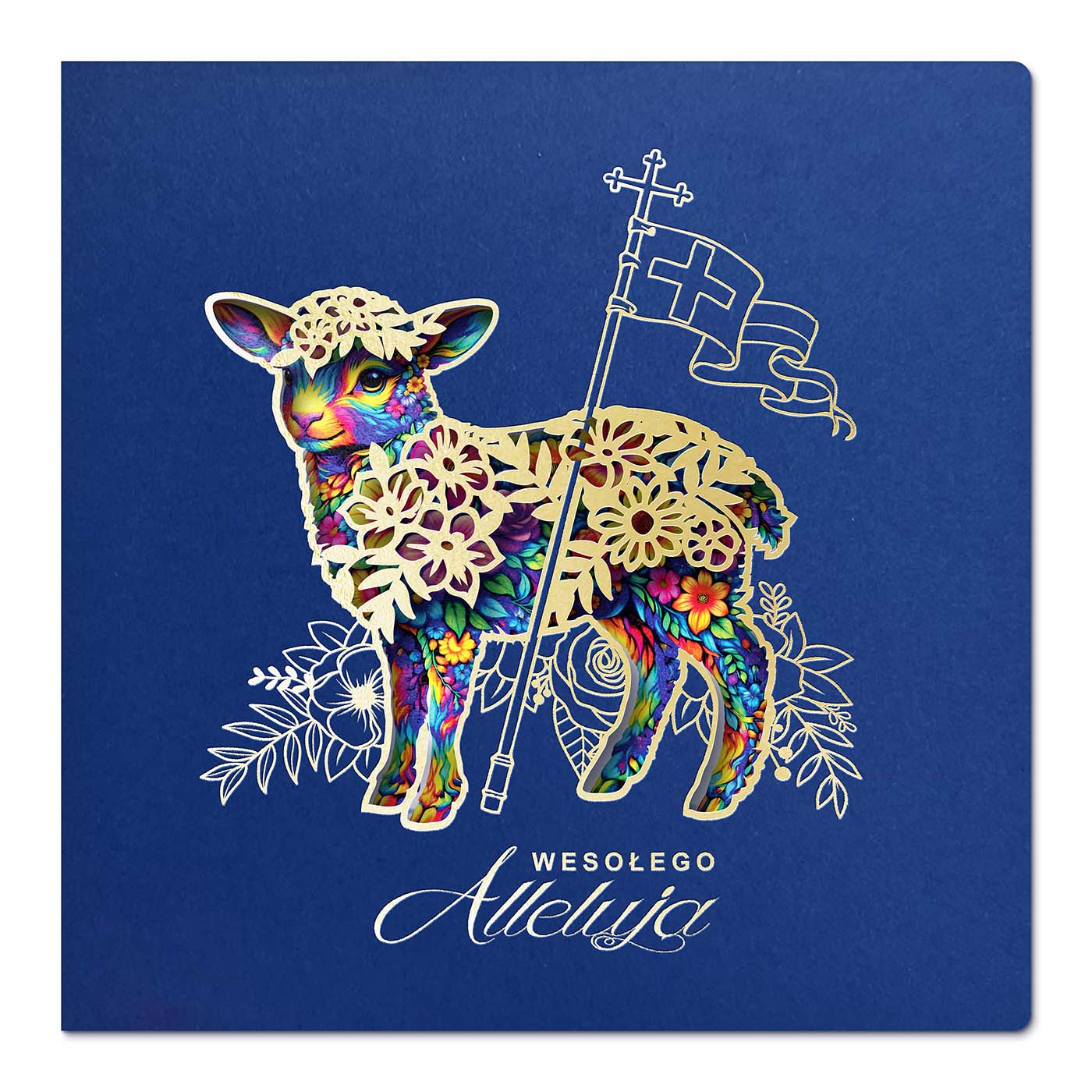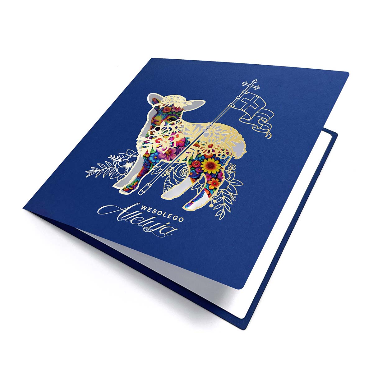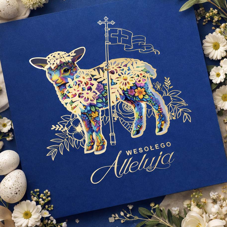 Centralnym motywem kartki jest Baranek Wielkanocny z chorągwią zwycięstwa, symbol Zmartwychwstania i nadziei. Motyw został opracowany w nowoczesnej, dekoracyjnej stylistyce, uzupełnionej precyzyjnymi elementami wycinanymi laserowo oraz złoceniem, które nadają kompozycji elegancki, przestrzenny charakter. Zastosowane techniki podkreślają jakość wykonania oraz dbałość o detal.