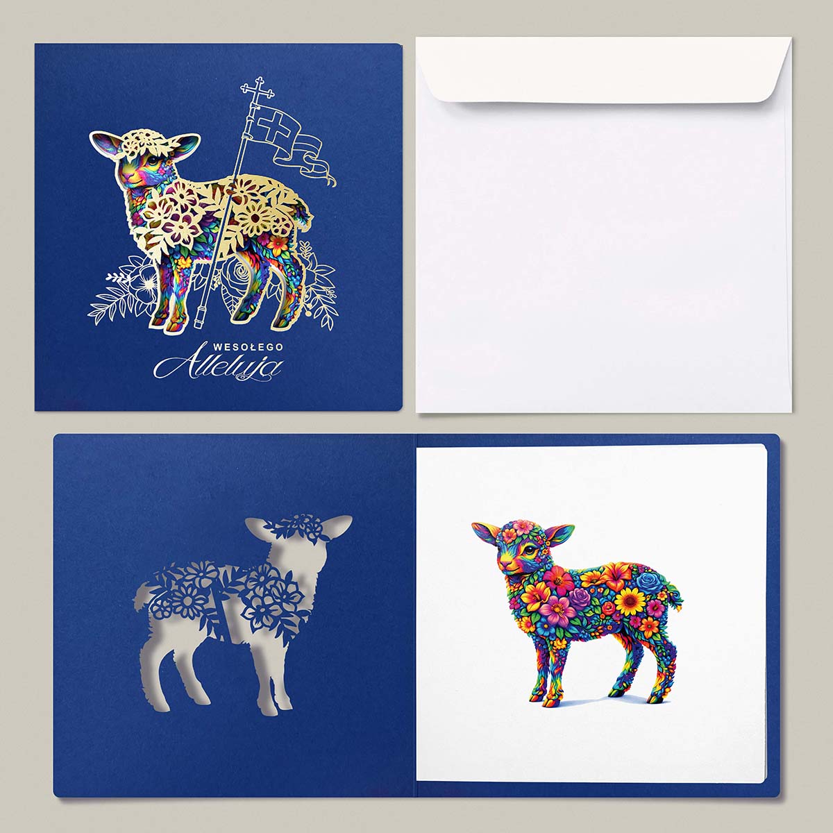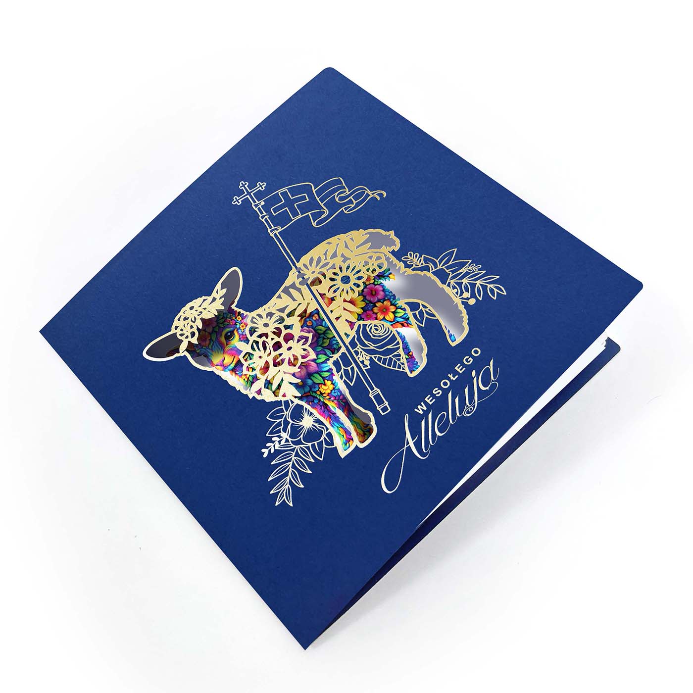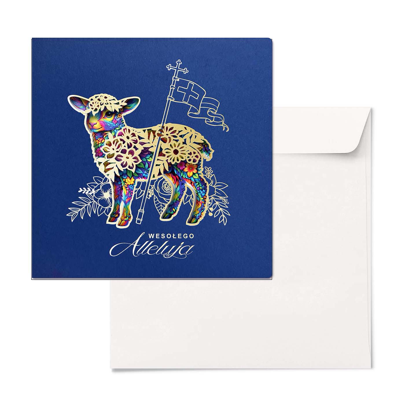 Centralnym motywem kartki jest Baranek Wielkanocny z chorągwią zwycięstwa, symbol Zmartwychwstania i nadziei. Motyw został opracowany w nowoczesnej, dekoracyjnej stylistyce, uzupełnionej precyzyjnymi elementami wycinanymi laserowo oraz złoceniem, które nadają kompozycji elegancki, przestrzenny charakter. Zastosowane techniki podkreślają jakość wykonania oraz dbałość o detal.
