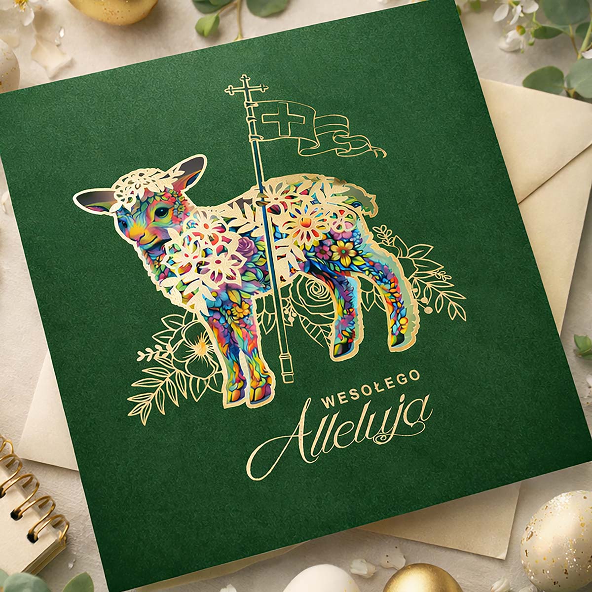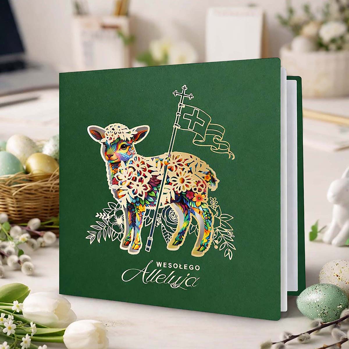 Centralnym motywem jest Baranek Wielkanocny z chorągwią zwycięstwa, jednoznacznie nawiązujący do Zmartwychwstania Chrystusa. Motyw został opracowany w dekoracyjnej, nowoczesnej stylistyce i uzupełniony precyzyjnymi elementami wycinanymi laserowo oraz złoceniem, które nadają całości elegancki, przestrzenny charakter i podkreślają wysoką jakość wykonania.