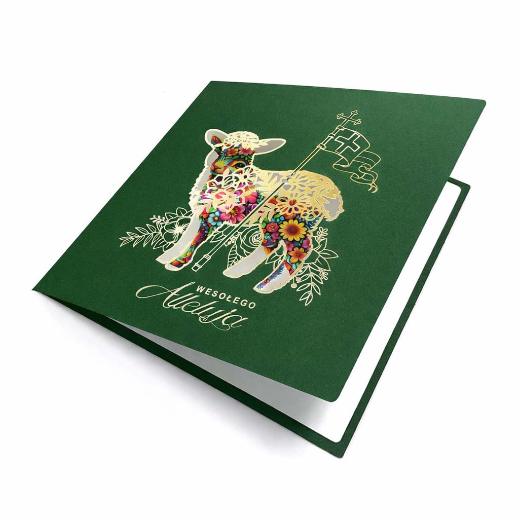 Okładka wykonana została z ozdobnego, matowego papieru w kolorze głębokiej zieleni, barwionego w masie. Stonowana, elegancka kolorystyka nadaje kartce powagi i harmonii, jednocześnie dobrze wpisując się w symbolikę Wielkanocy i wiosennego odrodzenia.