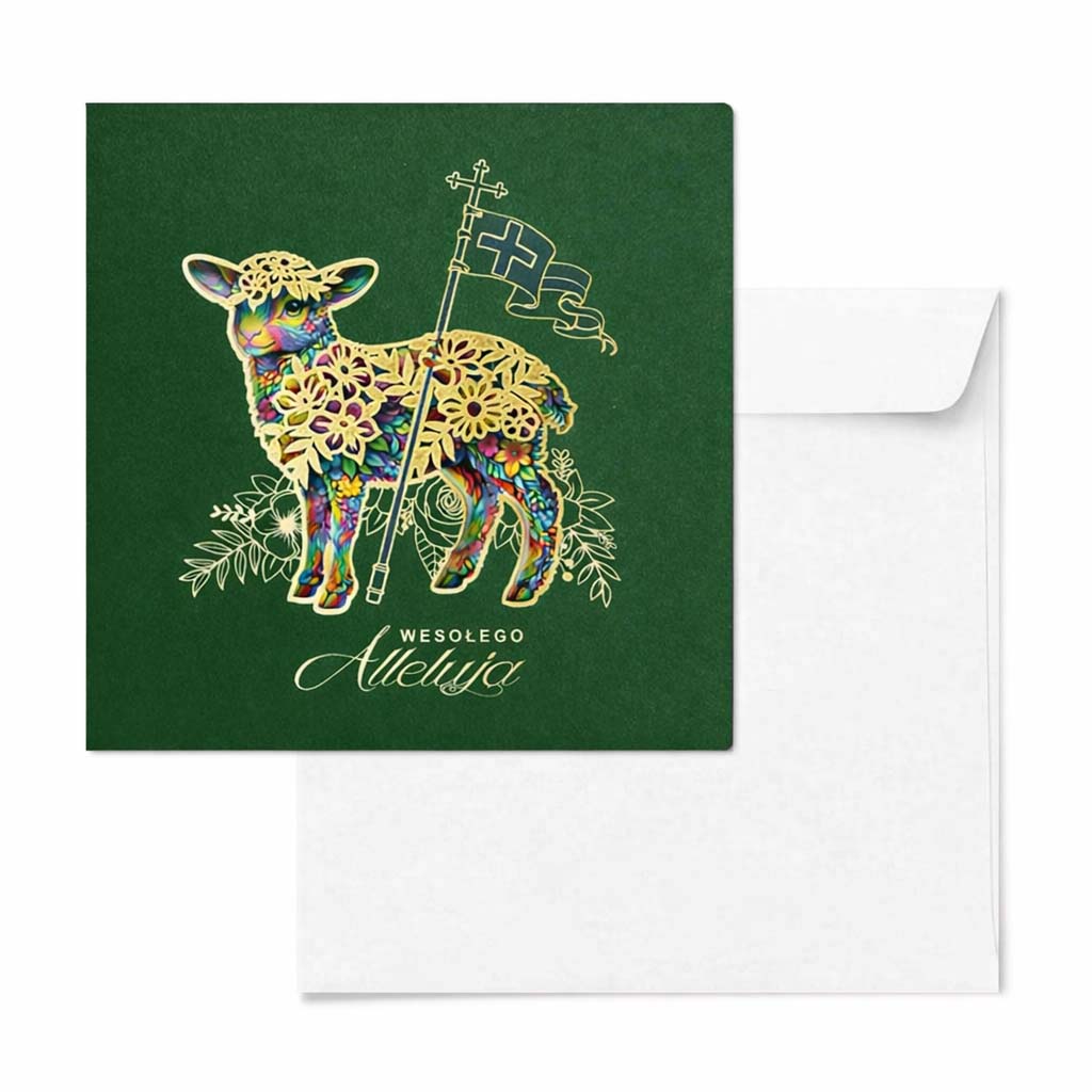 Na okładce umieszczony został klasyczny napis "Wesołego Alleluja", który w czytelny i godny sposób wzmacnia religijny przekaz kartki, zachowując przy tym odpowiedni dystans i formalność komunikacji.