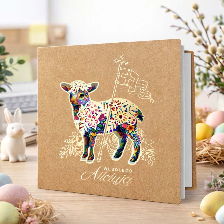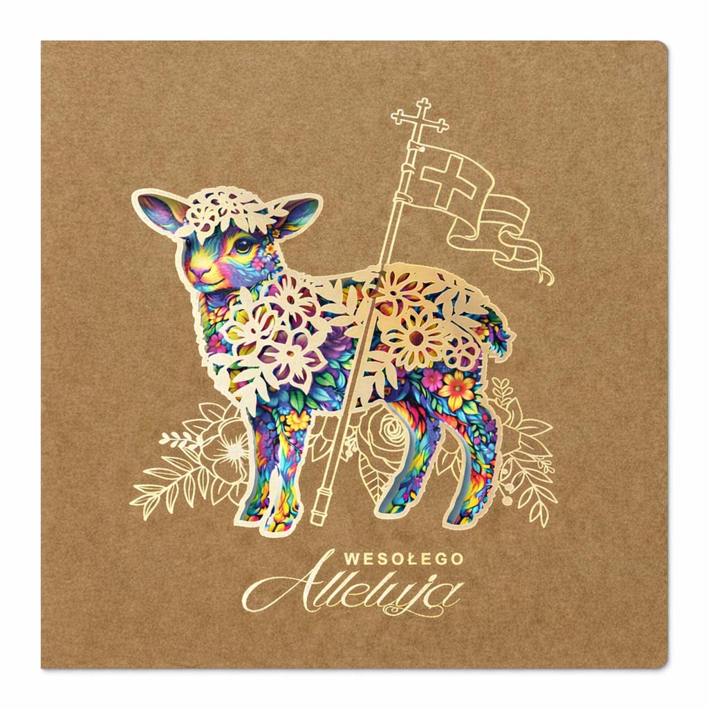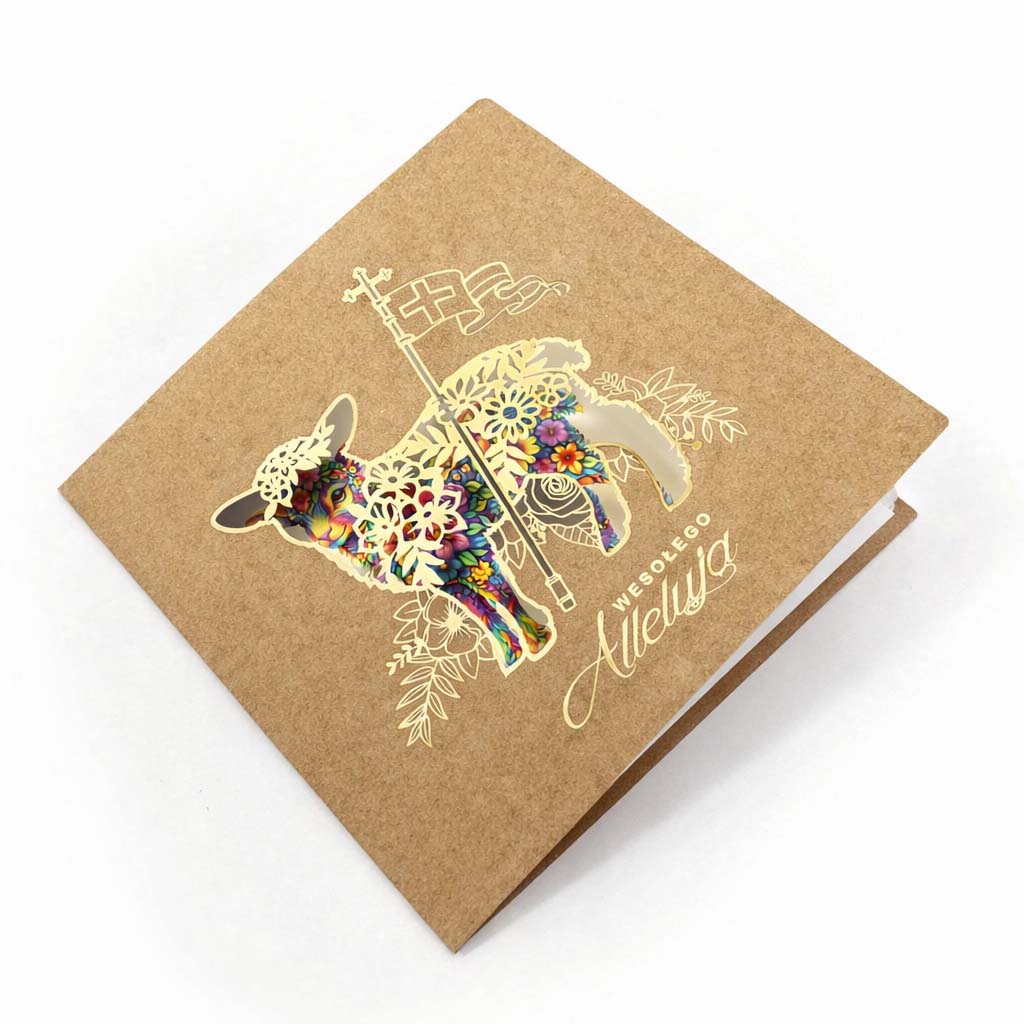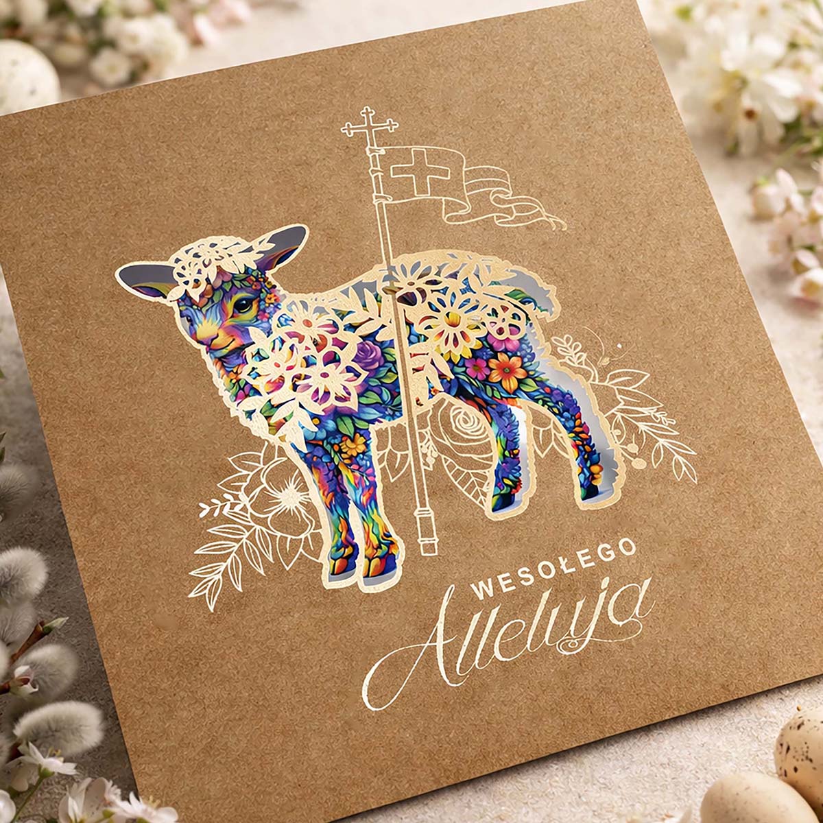 Centralnym motywem jest Baranek Wielkanocny z chorągwią zwycięstwa, symbol Zmartwychwstania i nadziei. Motyw opracowany został w nowoczesnej, dekoracyjnej stylistyce, zestawionej z precyzyjnymi elementami wycinanymi laserowo oraz subtelnymi akcentami zdobniczymi. Zastosowane techniki nadają kartce delikatny efekt przestrzenny i podkreślają wysoką jakość wykonania, bez nadmiernej dekoracyjności.