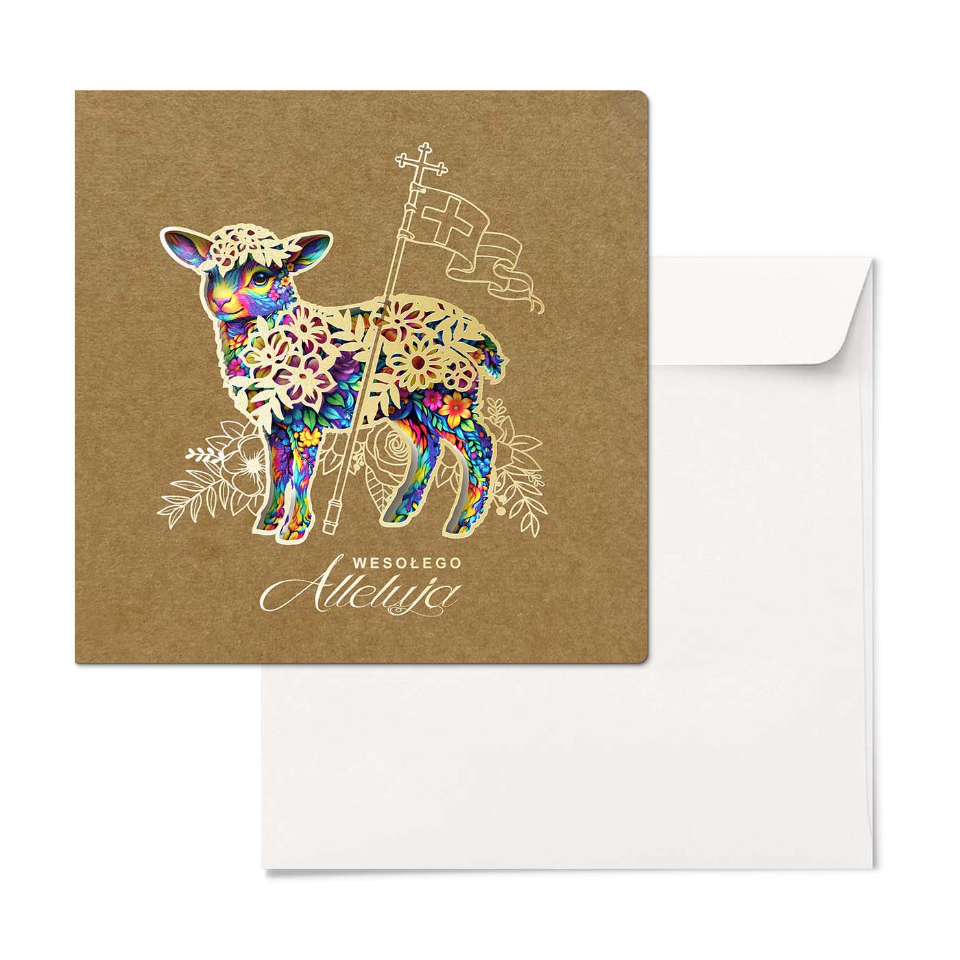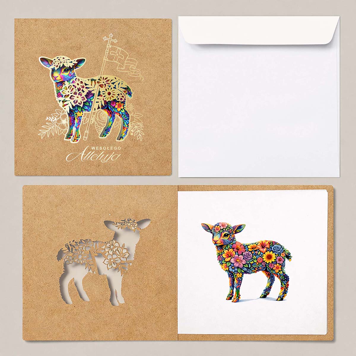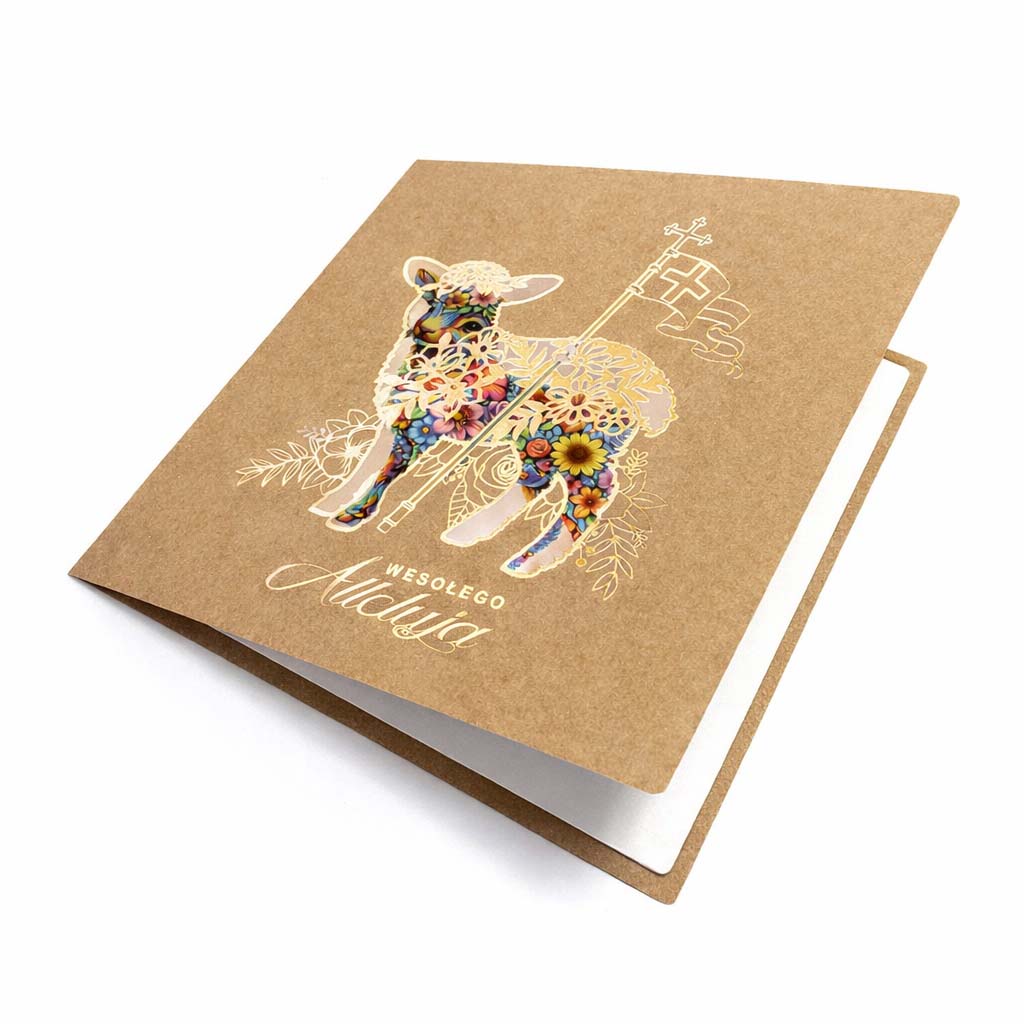 Centralnym motywem jest Baranek Wielkanocny z chorągwią zwycięstwa, symbol Zmartwychwstania i nadziei. Motyw opracowany został w nowoczesnej, dekoracyjnej stylistyce, zestawionej z precyzyjnymi elementami wycinanymi laserowo oraz subtelnymi akcentami zdobniczymi. Zastosowane techniki nadają kartce delikatny efekt przestrzenny i podkreślają wysoką jakość wykonania, bez nadmiernej dekoracyjności.