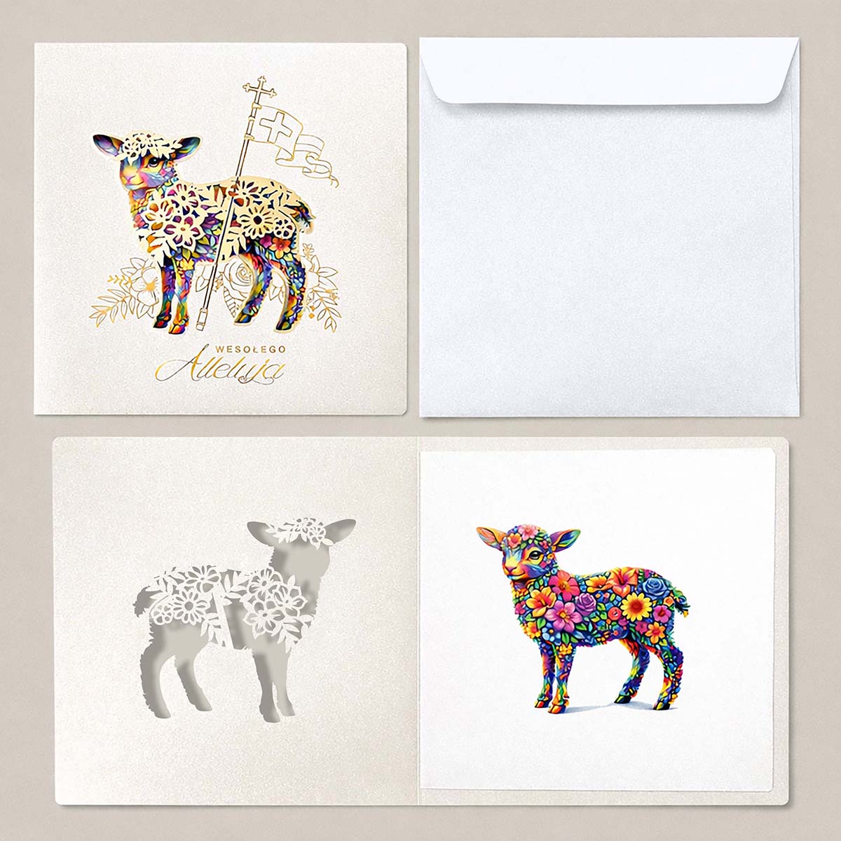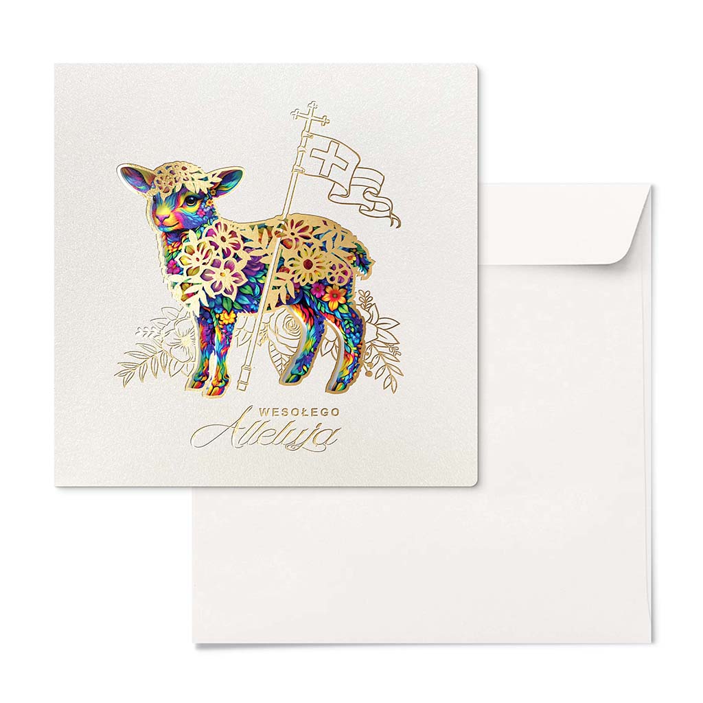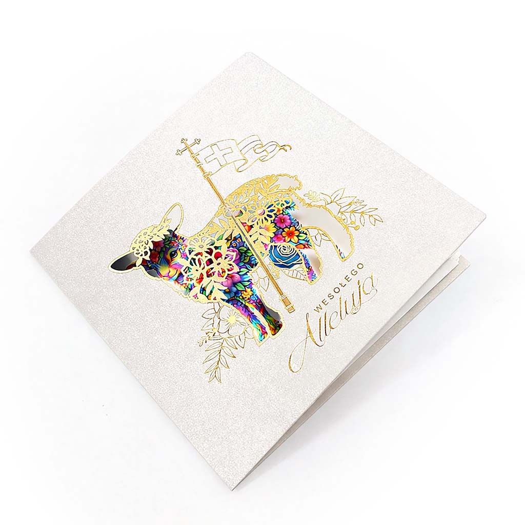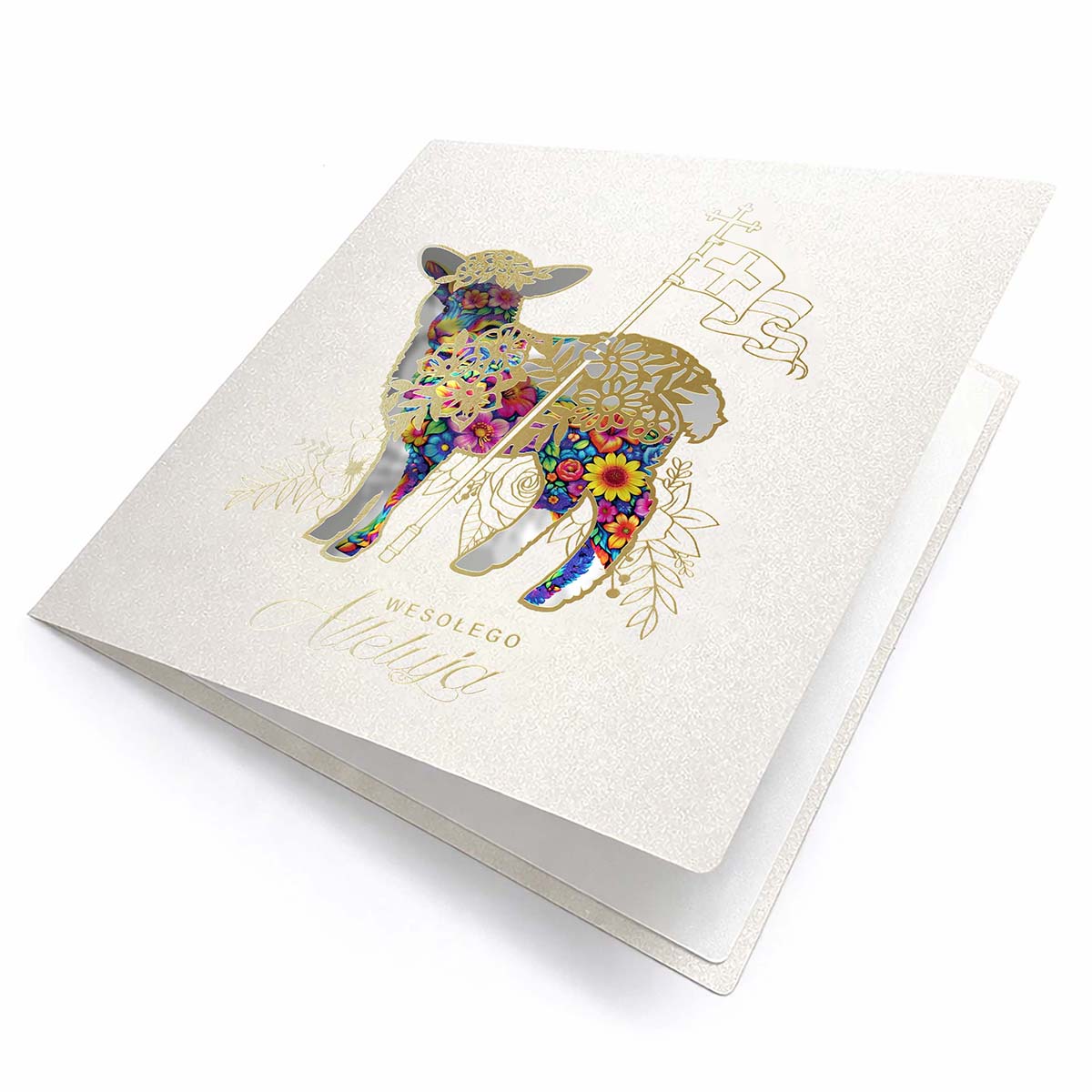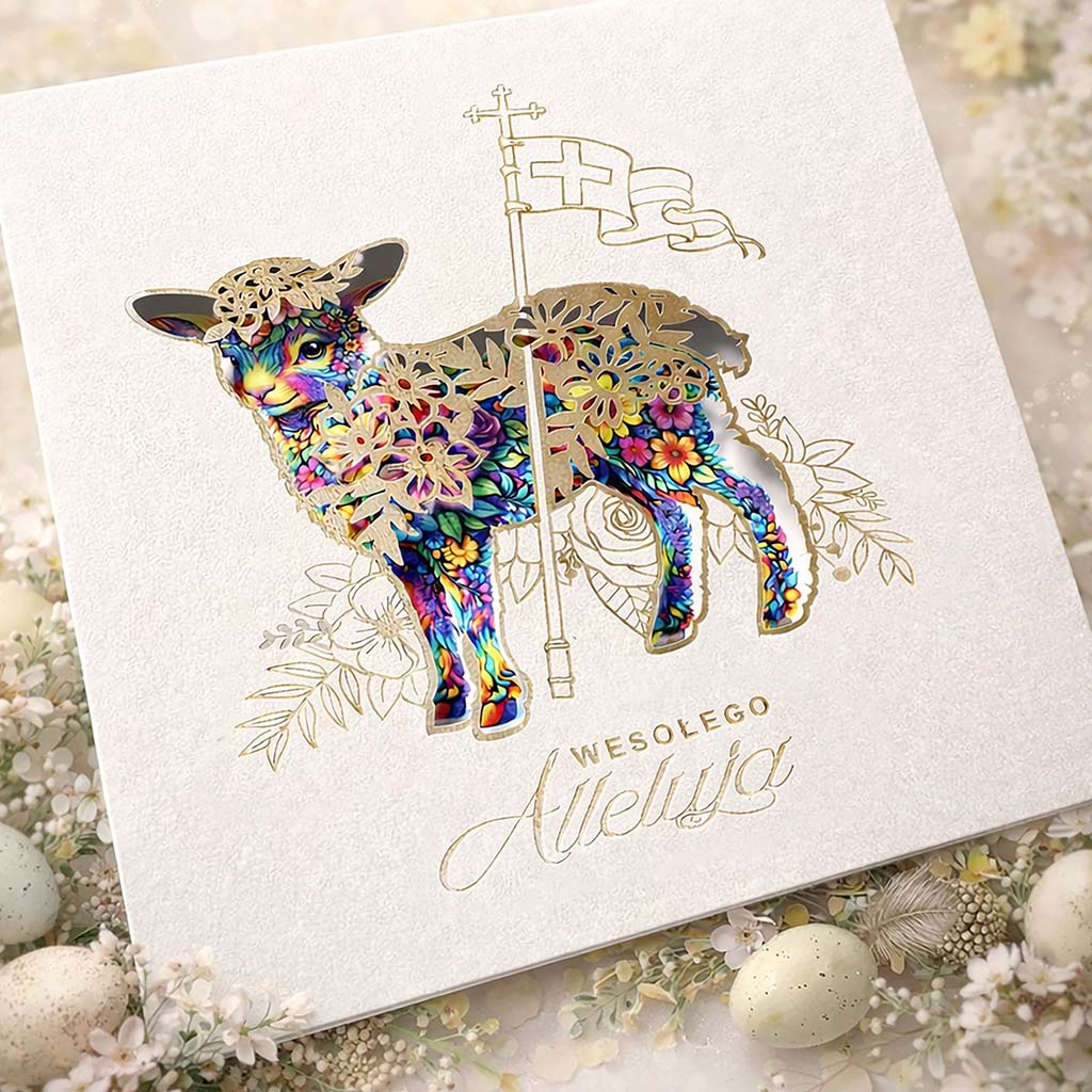 Centralnym motywem kartki jest Baranek Wielkanocny z chorągwią zwycięstwa, symbol Zmartwychwstania i nadziei. Motyw opracowany został w dekoracyjnej, nowoczesnej stylistyce i wzbogacony precyzyjnym cięciem laserowym oraz eleganckim złoceniem, które podkreślają detal, głębię kompozycji oraz kunszt wykonania.
