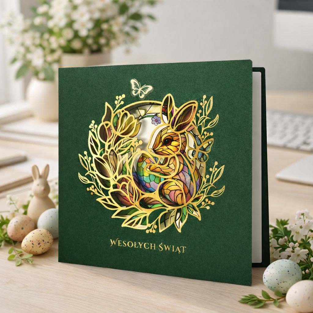 Elegancka kartka wielkanocna o wyraźnie biznesowym charakterze, zaprojektowana z myślą o profesjonalnej i reprezentacyjnej komunikacji świątecznej. Klasyczna forma została połączona z nowoczesnymi technikami uszlachetniania, tworząc spójną i estetyczną całość.
