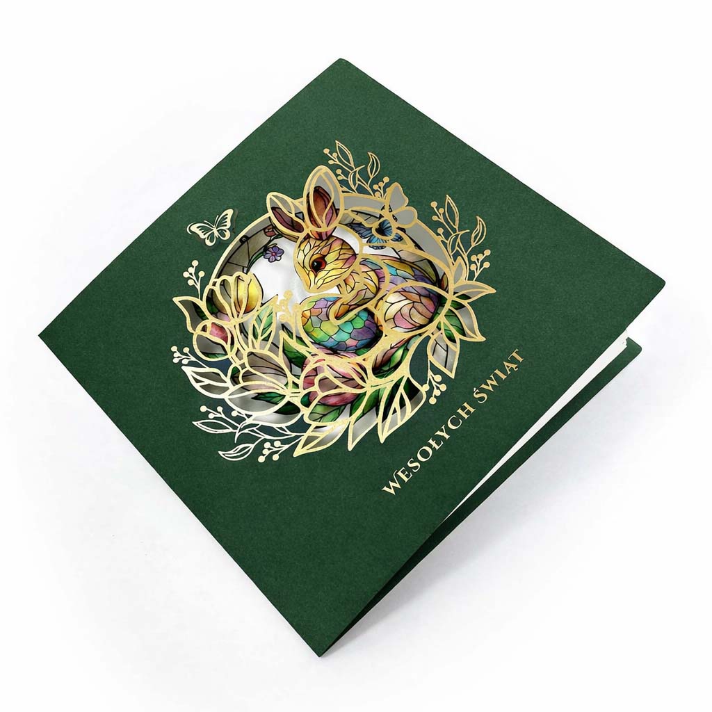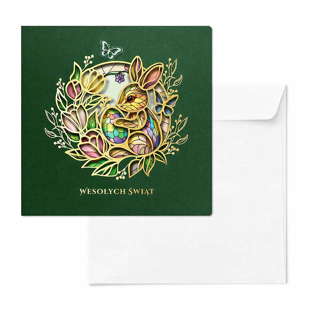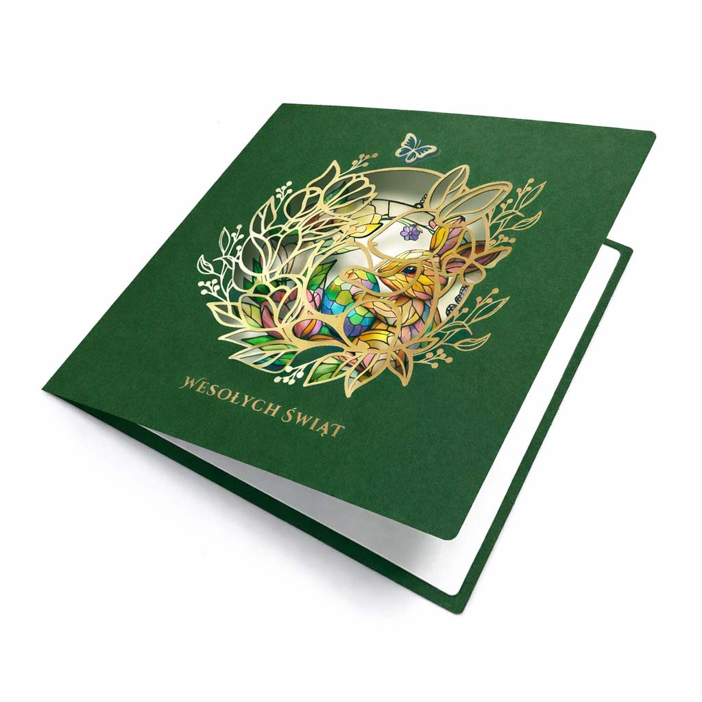 Okładka wykonana jest z wysokiej jakości matowego papieru w kolorze głębokiej zieleni. Centralny element stanowi dekoracyjny motyw zająca wielkanocnego wykonany techniką precyzyjnego cięcia laserowego i złocenia, który subtelnie odsłania wnętrze kartki. Na wkładce umieszczono kolorowy, wiosenny nadruk z zajączkiem, pisankami, motylami i kwiatami, nadający całości świąteczny, lecz elegancki charakter.