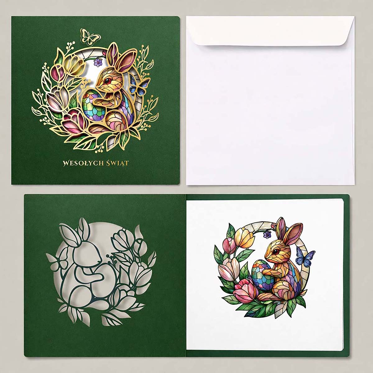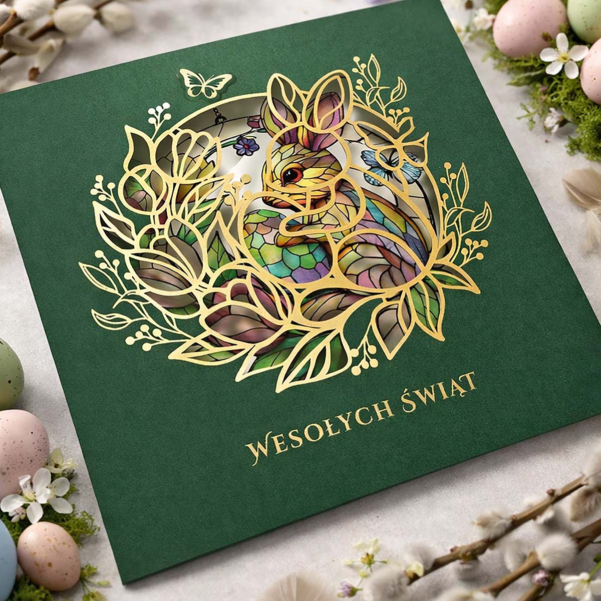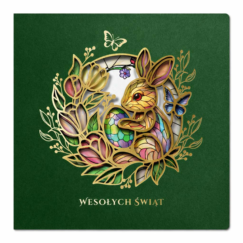 Okładka wykonana jest z wysokiej jakości matowego papieru w kolorze głębokiej zieleni. Centralny element stanowi dekoracyjny motyw zająca wielkanocnego wykonany techniką precyzyjnego cięcia laserowego i złocenia, który subtelnie odsłania wnętrze kartki. Na wkładce umieszczono kolorowy, wiosenny nadruk z zajączkiem, pisankami, motylami i kwiatami, nadający całości świąteczny, lecz elegancki charakter.