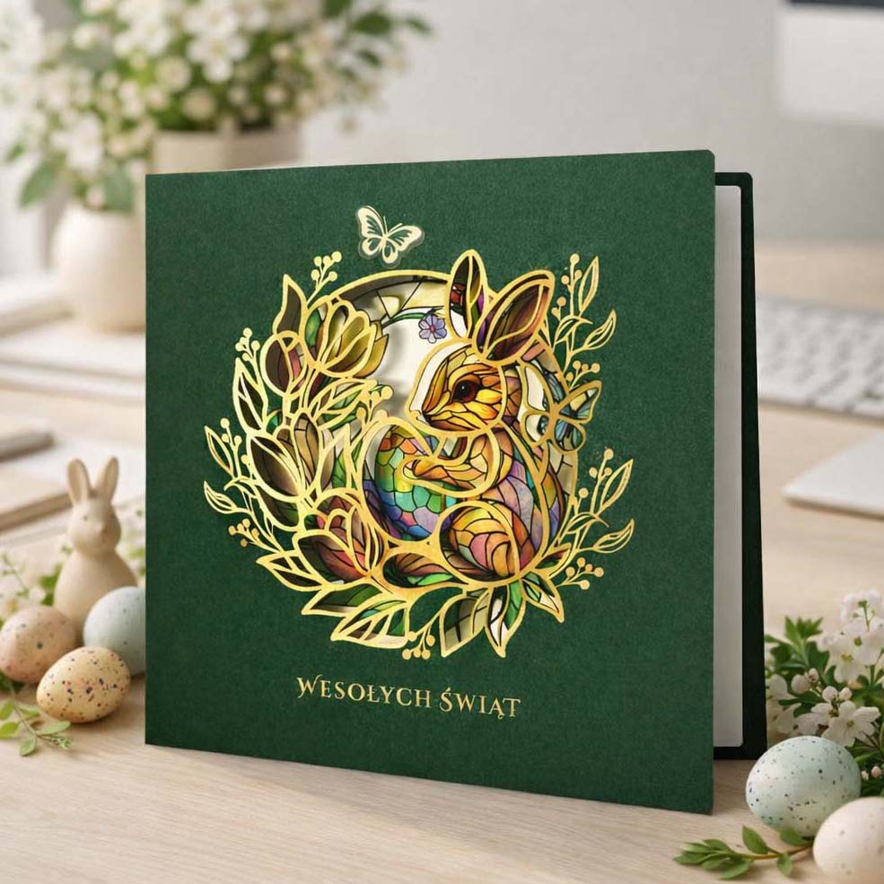 Elegancka kartka wielkanocna o wyraźnie biznesowym charakterze, zaprojektowana z myślą o profesjonalnej i reprezentacyjnej komunikacji świątecznej. Klasyczna forma została połączona z nowoczesnymi technikami uszlachetniania, tworząc spójną i estetyczną całość.