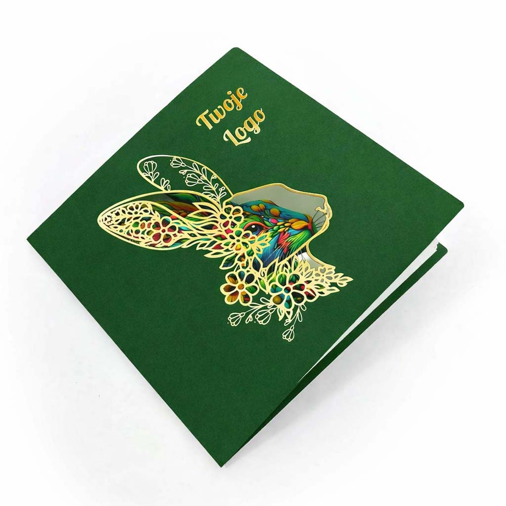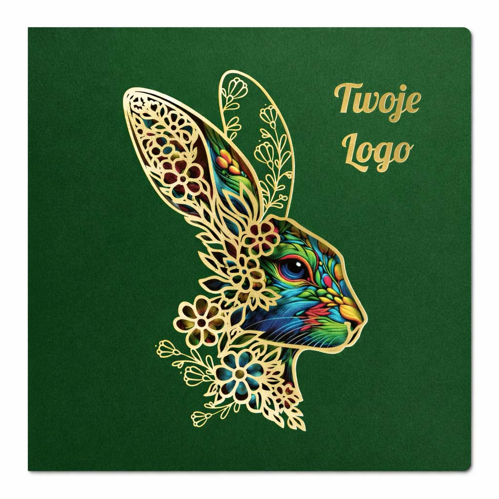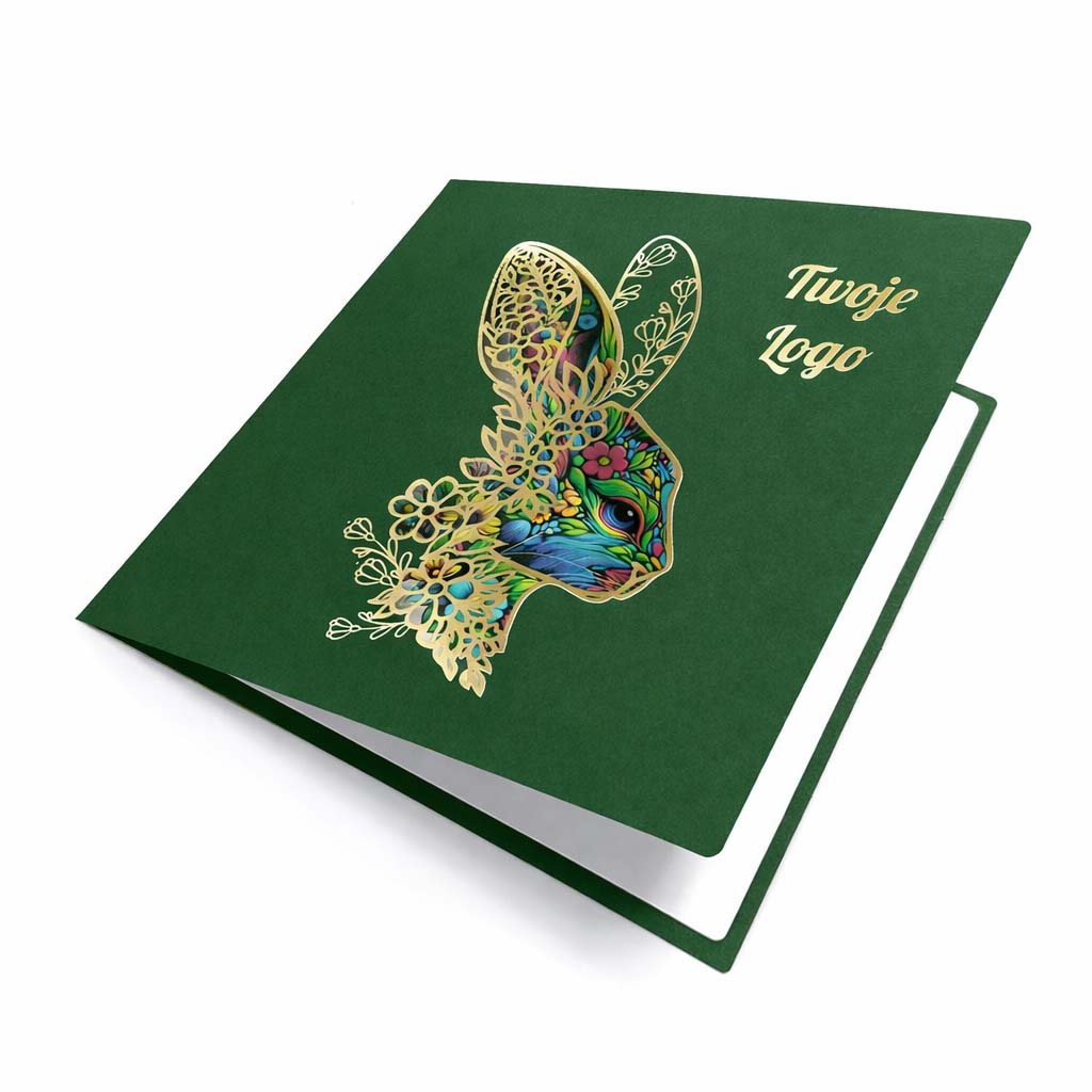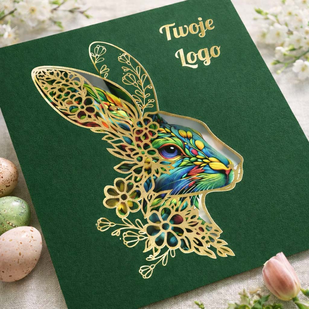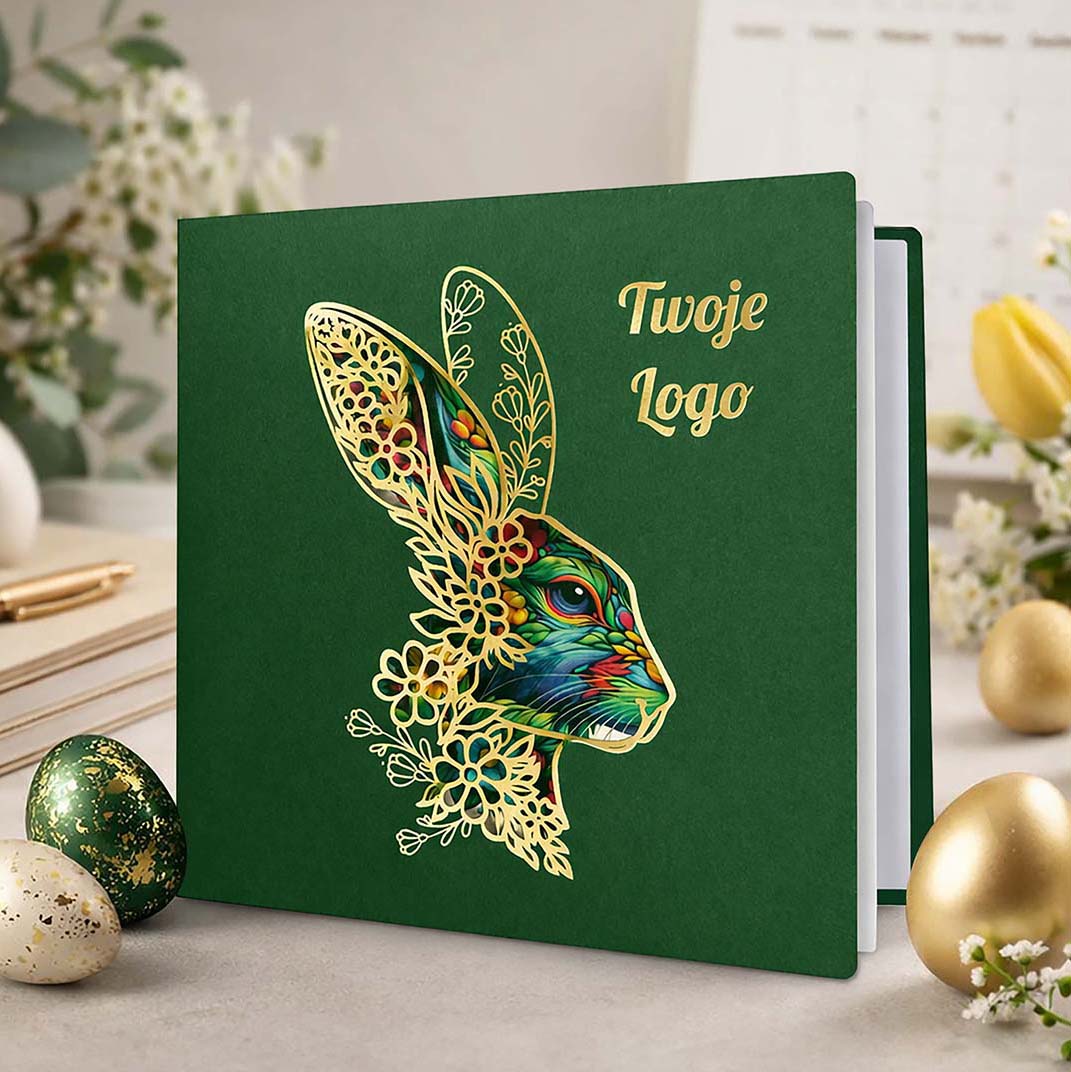 Elegancka kartka wielkanocna zaprojektowana z myślą o firmach i instytucjach, które cenią spójny wizerunek, wysoką estetykę oraz ponadczasową formę świątecznych życzeń. Głęboka zieleń okładki w połączeniu ze złotymi detalami tworzy kompozycję wyważoną, prestiżową i doskonale wpisującą się w charakter komunikacji biznesowej.
