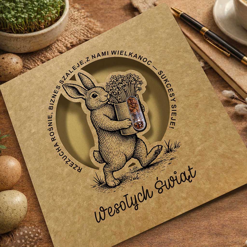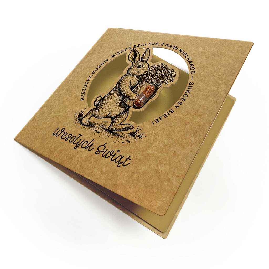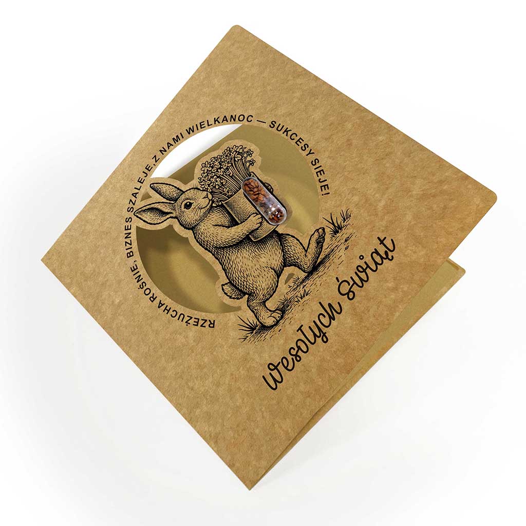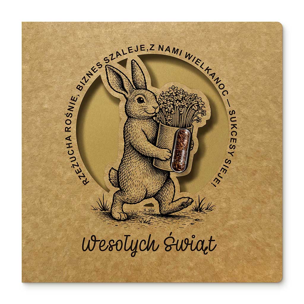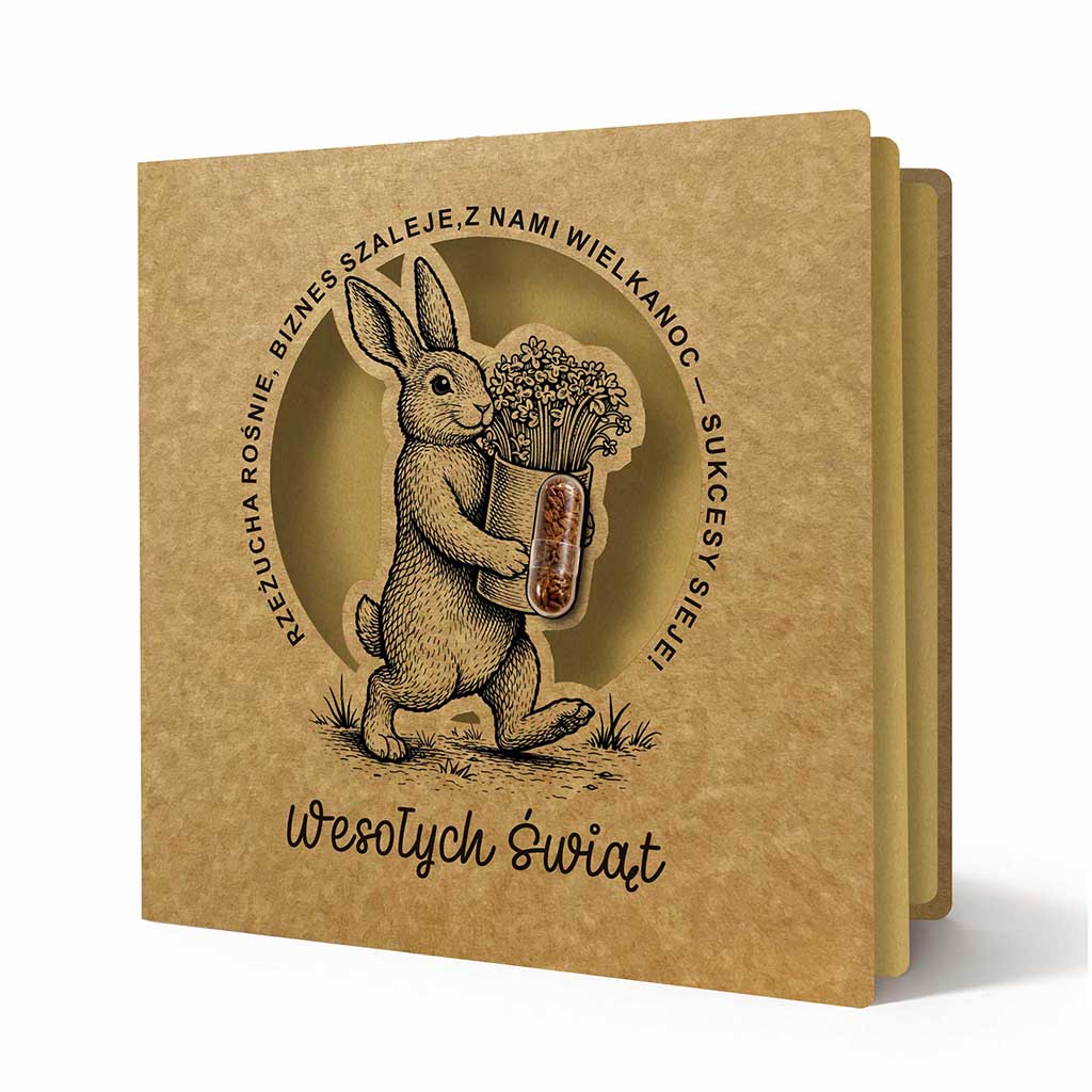 Wyjątkowa ekologiczna kartka z motywem wielkanocnego zająca i kapsułką z nasionami rzeżuchy, która łączy tradycyjną formę z nowoczesnym, interaktywnym detalem. Naturalna kraftowa kolorystyka oraz realistyczna grafika inspirowana dawnymi ilustracjami botanicznymi nadają projektowi ponadczasowy charakter, a kapsułka z nasionami wprowadza element życia - dosłownie.
