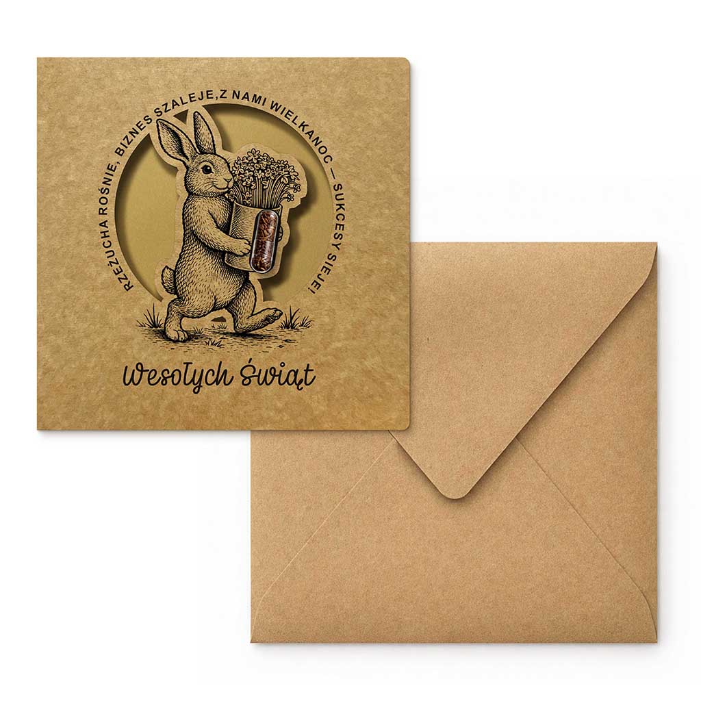 Kartka została wykonana z wysokiej jakości papieru ekologicznego o wyraźnej, naturalnej fakturze i ciepłym, beżowo-kraftowym odcieniu. Okładkę zdobi precyzyja ilustracja zająca niosącego doniczkę z rzeżuchą. Wkomponowana w projekt transparentna kapsułka z naturalnymi nasionami stanowi integralny element kompozycji. Po wysianiu rzeżucha wyrasta w kilka dni, tworząc świeżą, zieloną dekorację - symbol wzrostu, energii i nowych możliwości.