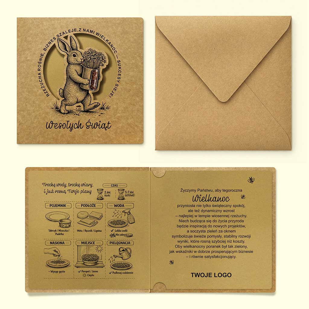 Wnętrze kartki zawiera miejsce na indywidualne życzenia oraz logo firmowe. Po lewej stronie znajduje się estetyczna, graficzna instrukcja wysiewu rzeżuchy w formie czytelnych piktogramów. Całość uzupełnia dopasowana koperta kraftowa, tworząca spójny, elegancki zestaw utrzymany w duchu ekologii i świadomego designu.