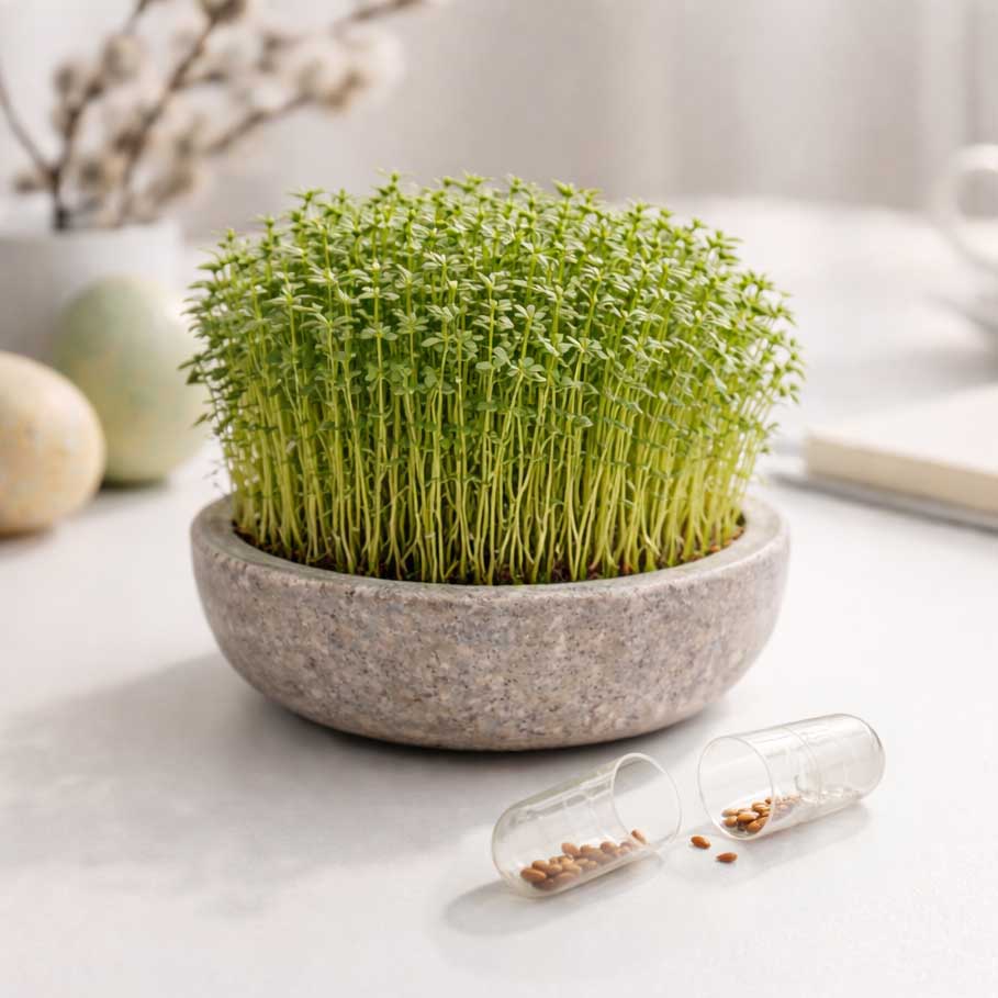 Element interaktywny: kapsułka z naturalnymi nasionami rzeżuchy do samodzielnego wysiewu