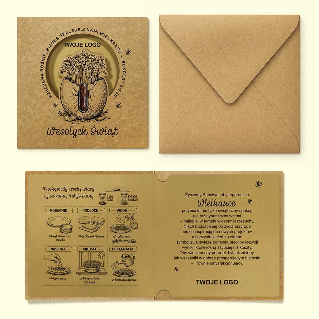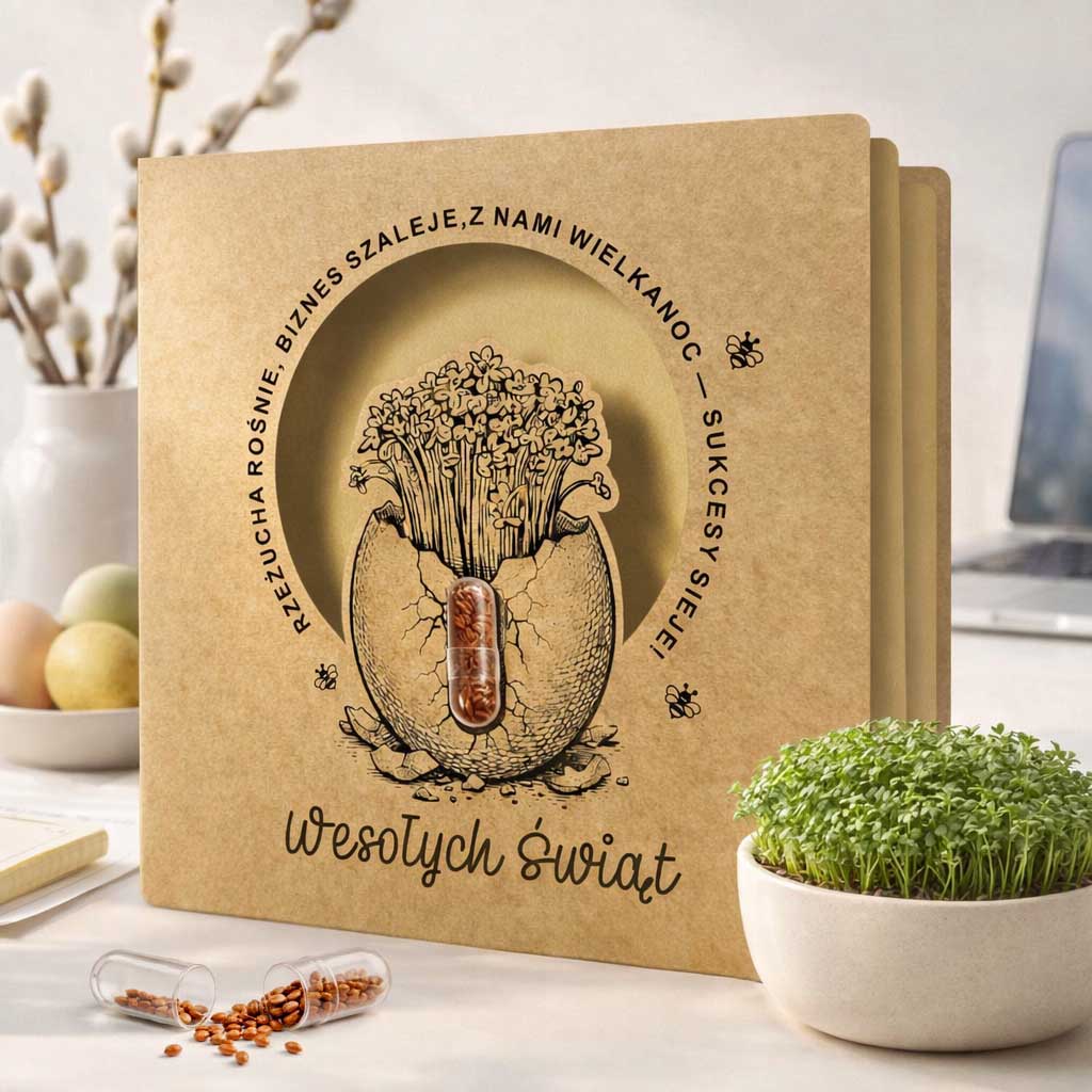 Projekt doskonale sprawdzi się jako biznesowa kartka wielkanocna dla klientów i partnerów, podkreślając proekologiczne wartości marki, a jednocześnie oferując coś więcej niż sam druk - realne doświadczenie.