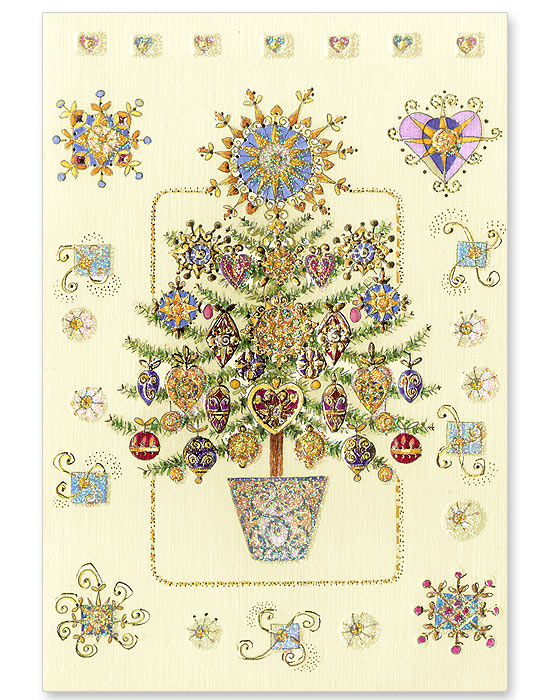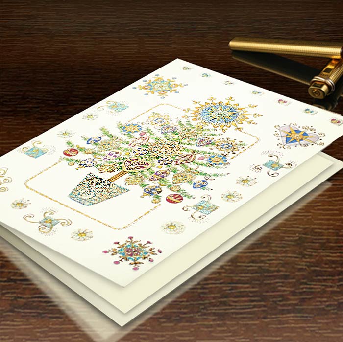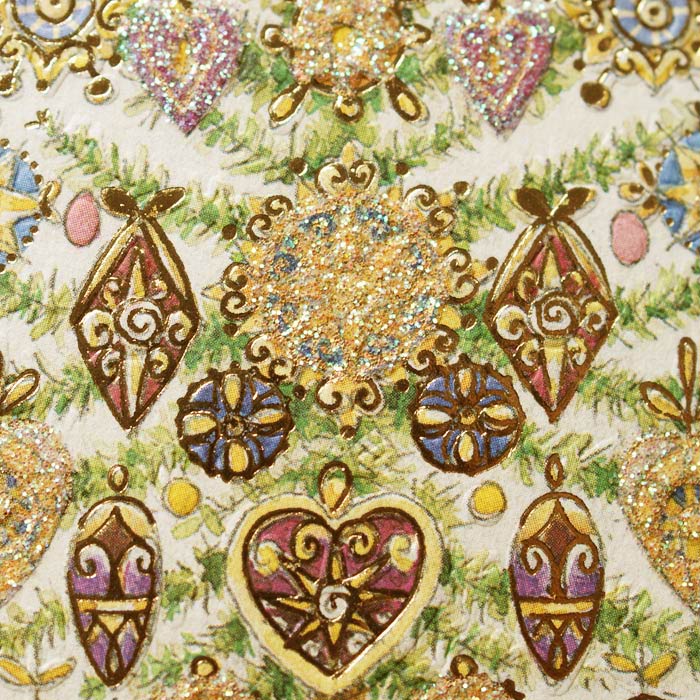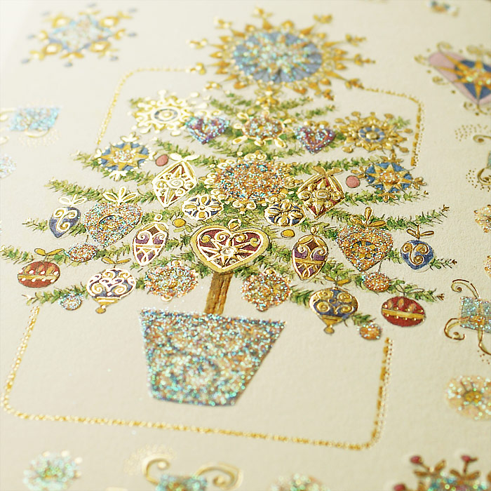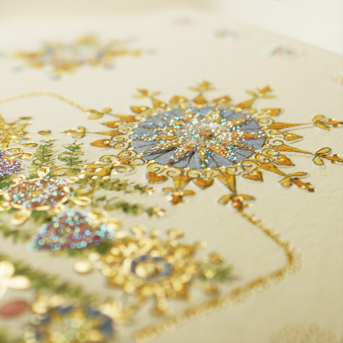 Wykonana z papieru ekologicznego w kolorze ecru. Kartę zdobią kolorowe, świąteczne, tłoczone oraz złocone elementy. Całość dopełniają mieniące się drobinki brokatowe. Nadruk życzeń wykonujemy na matowej wkładce w kolorze ecru.