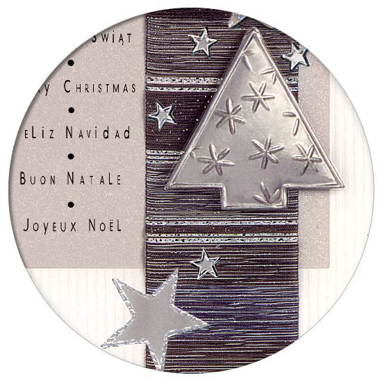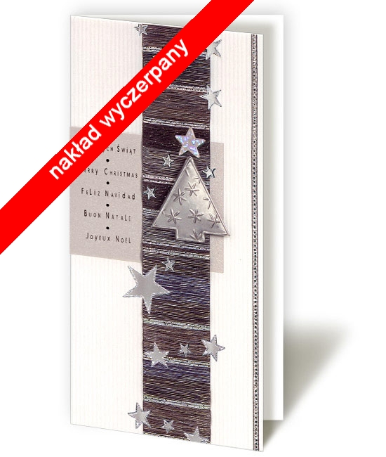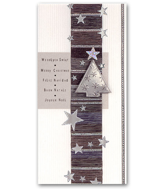 Okładka karty z nadrukowanym szerokim, ciemnym pasem ozdobionym tłoczonymi gwiazdkami i choinką. Dodatkowo - gwiazdki mają wysrebrzone brzegi. Z prawej strony okładki delikatny, wąski szlaczek z wysrebrzonymi kropeczkami. Z lewej strony nadrukowane życzenia świąteczne w kilku językach. Nadruk życzeń wykonujemy na matowej wkładce w kolorze białym.