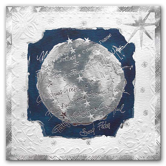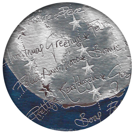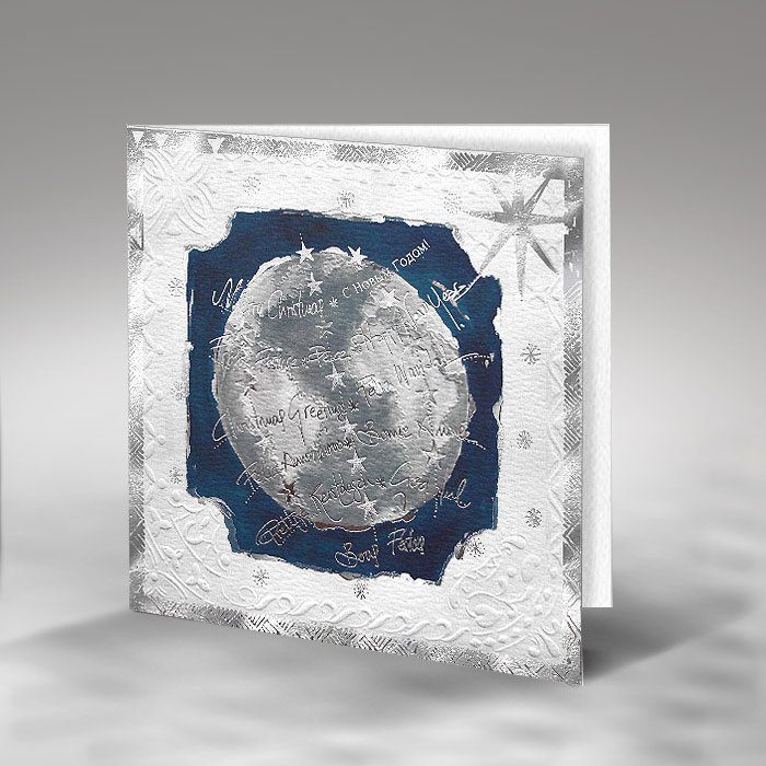 W centralnej części glob ziemski z wytłoczonym zarysem kontynentów. Karta bogato ozdobiona srebrzonymi gwiazdkami i świątecznymi życzeniami w różnych językach. Dookoła na białym tle różnego rodzaju elementy tłoczone szlaczków. Brzeg wysrebrzony. W górnym, prawym rogu srebrzona gwiazda. Nadruk życzeń wykonujemy na wkładce.