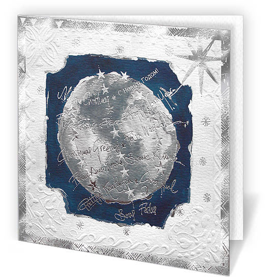 W centralnej części glob ziemski z wytłoczonym zarysem kontynentów. Karta bogato ozdobiona srebrzonymi gwiazdkami i świątecznymi życzeniami w różnych językach. Dookoła na białym tle różnego rodzaju elementy tłoczone szlaczków. Brzeg wysrebrzony. W górnym, prawym rogu srebrzona gwiazda.