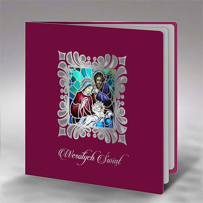Zachwycająca kartka świąteczna o głęboko religijnym przesłaniu, wykonana z wysokiej jakości matowego papieru barwionego w masie w odcieniu głębokiego bordo. Centralnym elementem kompozycji jest barwny motyw Świętej Rodziny, przywodzący na myśl witrażowe przeszklenia - nadrukowany z fotograficzną precyzją i uszlachetniony techniką hotstampingu. Całość oprawiona została w misterne, ażurowe wycięcie w formie ramy, które podkreśla sakralny charakter projektu. Wkładka do nadruku srebrna, metalizowana, dodaje całości eleganckiego wykończenia.