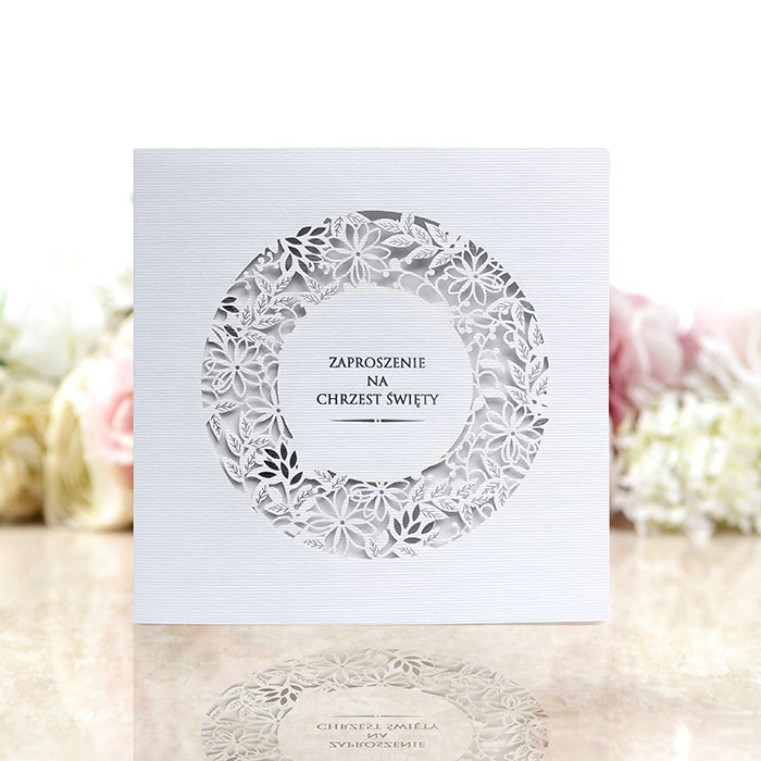 Zaproszenie na chrzest wykonane z wysokiej jakości fakturowanego papieru w białym kolorze. Okładkę zdobi srebrzenie z misternym cięciem laserowym. Wkładka do nadruku srebrna metalizowana.