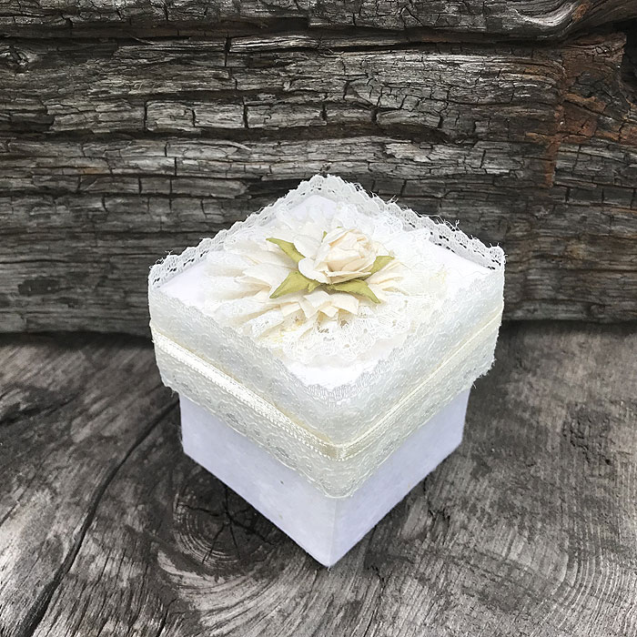 Pudełeczko na drobne prezenty dla gości. Wykonane z wysokiej jakości papieru czerpanego w kolorze ecru. Delikatna koronka i wtapiane różyczki idealnie pasują do wystroju sali weselnej w stylu boho.